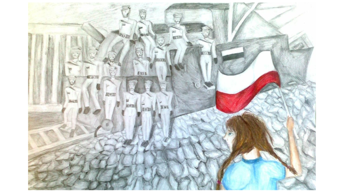 Karolina Kowal z klasy 4a ukazała ten wyjątkowy moment z perspektywy dziecka. Technika wykonania pracy została ograniczona do miękkich ołówków i kredek. Szczególnie interesujący jest kontrast szarości z biało-czerwoną flagą oraz błękitnym ubraniem dziewczynki. ✏️
