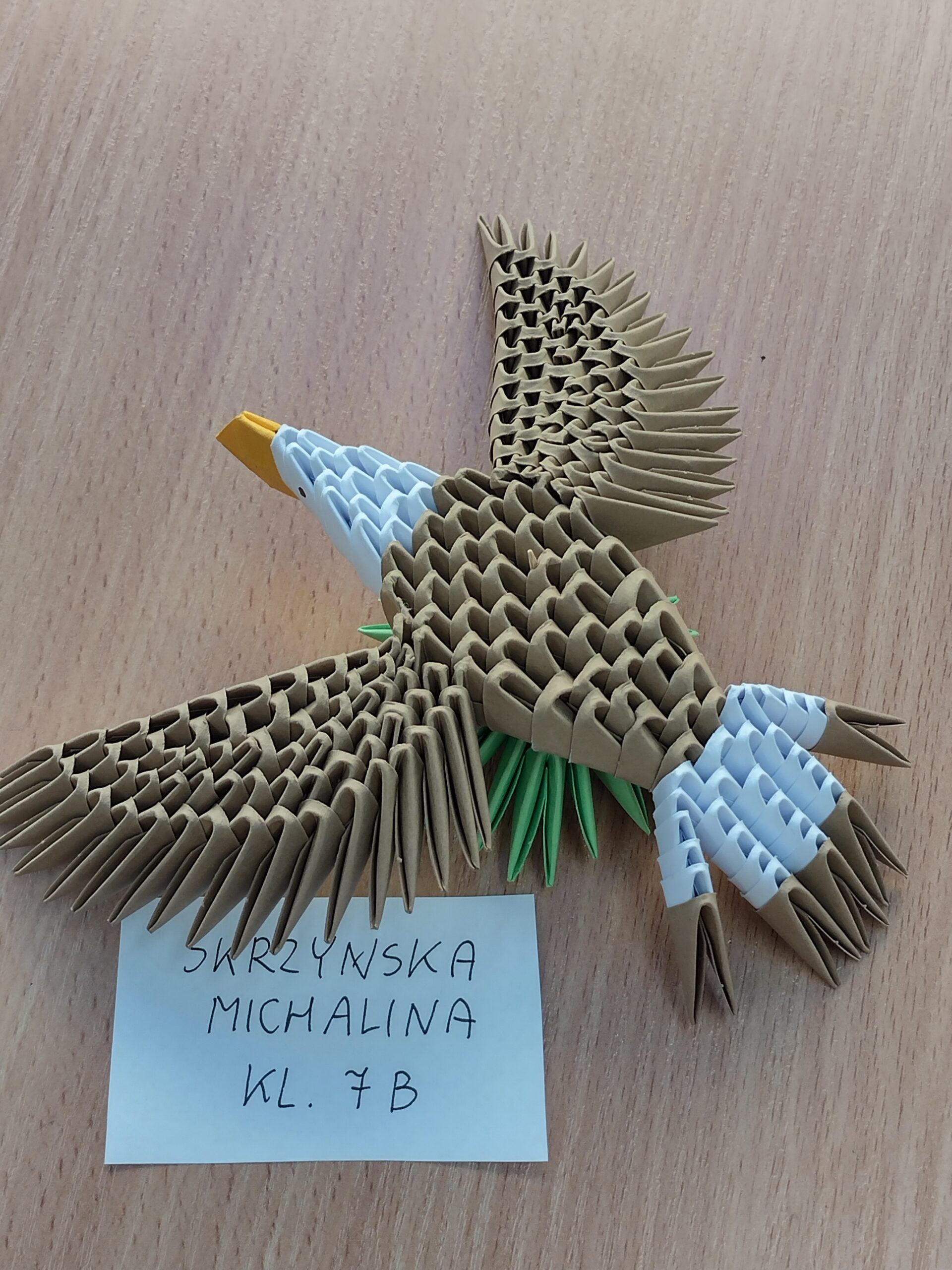 Karolina Kowal z klasy 4a ukazała ten wyjątkowy moment z perspektywy dziecka. Technika wykonania pracy została ograniczona do miękkich ołówków i kredek. Szczególnie interesujący jest kontrast szarości z biało-czerwoną flagą oraz błękitnym ubraniem dziewczynki.