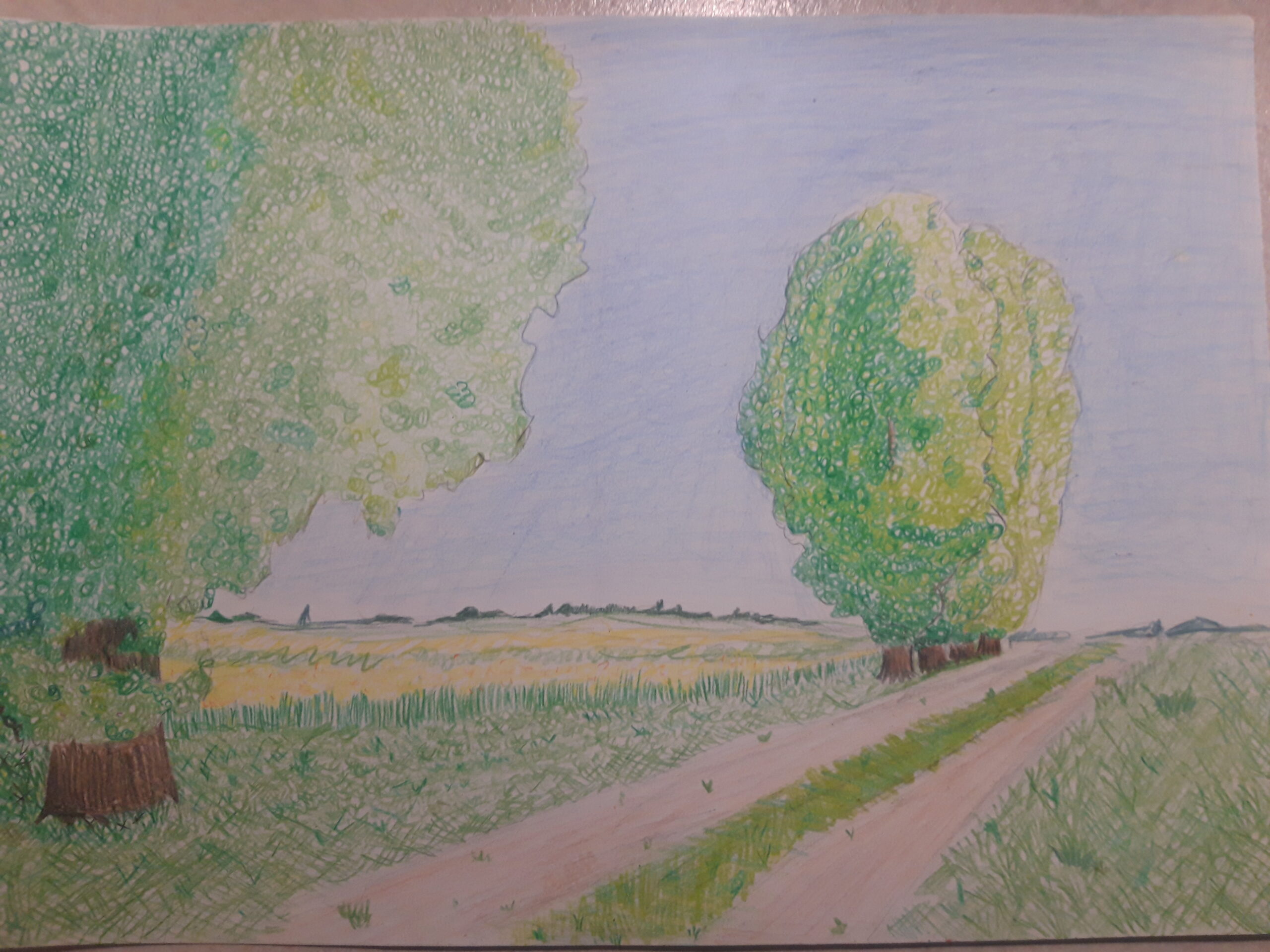 Z dumą prezentujemy wyjątkową pracę plastyczną wykonaną przez Natalię Kaptacz z klasy 4e. Jej pierwsze dzieło, zatytułowane „Pejzaż”, powstało w szkolnej pracowni plastycznej i zachwyciło doskonałą kompozycją, precyzyjnym oddaniem perspektywy, subtelnym rozjaśnieniem nieba przy linii horyzontu oraz piękną gradacją światła i cienia.