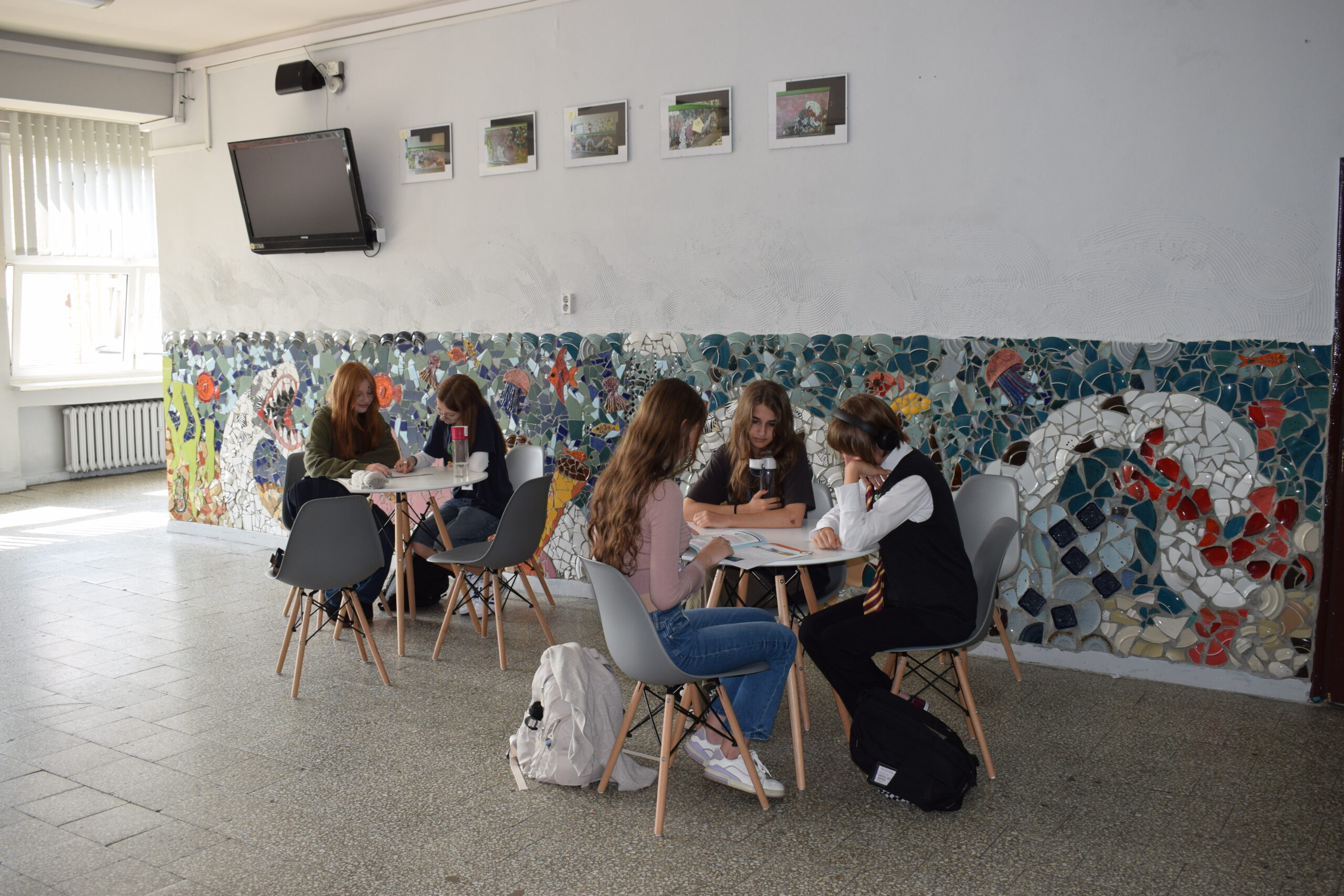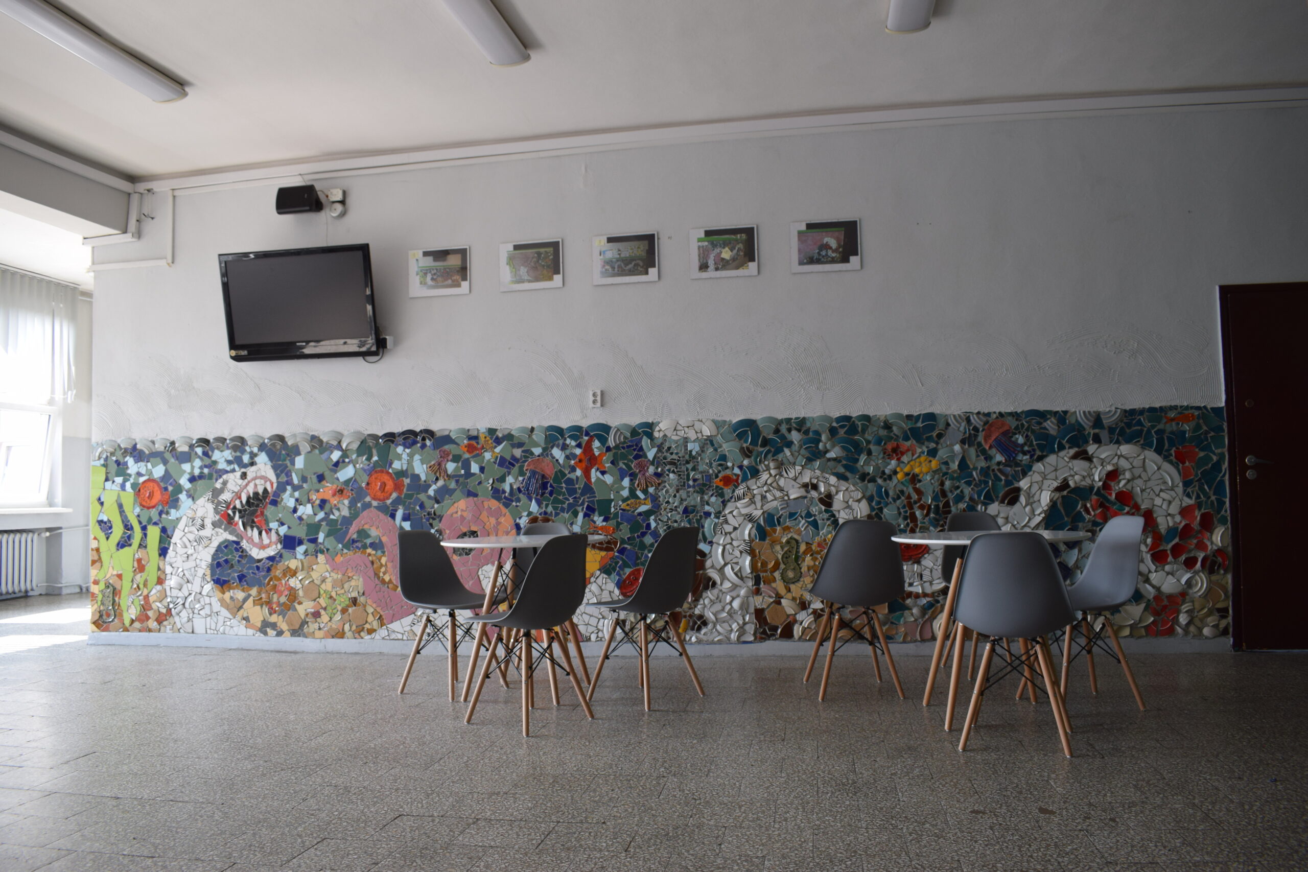 Na II piętrze 🏫 obok sali plastycznej 🎨 i biologicznej 🔬 pojawiły się nowoczesne stoliczki i krzesełka 🪑☕, ale prawdziwą atrakcją jest mural ceramiczny.