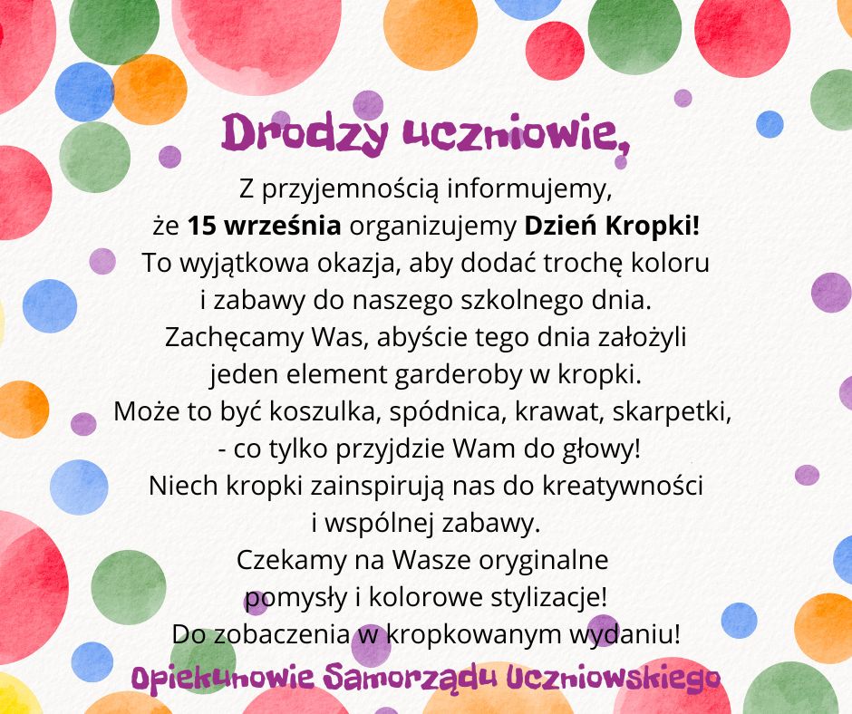 https://sp45.edu.pl/wp-content/uploads/2025/09/Dzien-Kropki.jpg 940 788 Los Majkelos Los Majkelos https://secure.gravatar.com/avatar/96eacdbeae07327cd9480385eb550516?s=96&d=mm&r=g 12 września 2025 14 września 2025 Załóżcie coś w kropki – koszulkę, spódnicę, krawat, skarpetki albo cokolwiek, co wpadnie Wam do głowy! Niech kropki dodadzą kolorów i kreatywności naszemu szkolnemu dniowi Czekamy na Wasze pomysłowe stylizacje! Do zobaczenia w kropkowanej wersji!