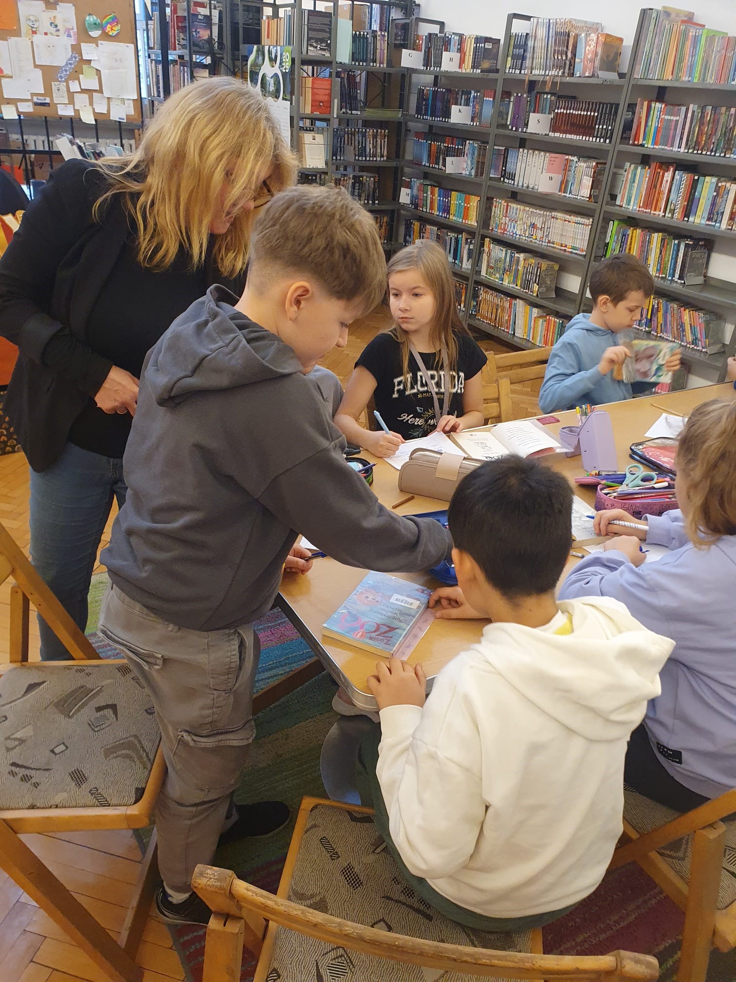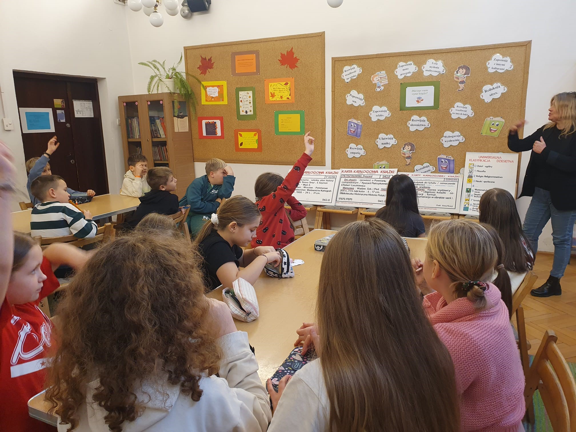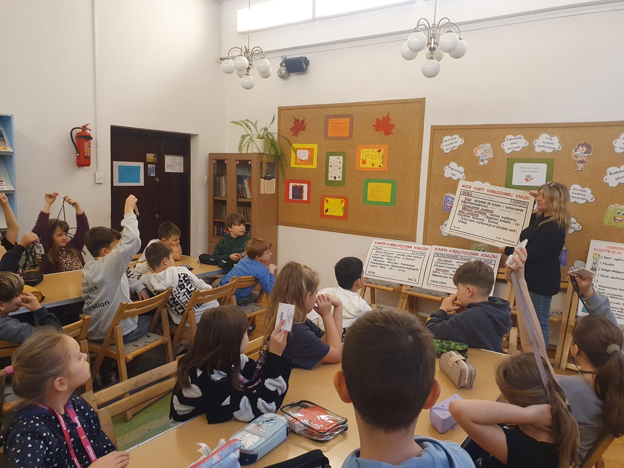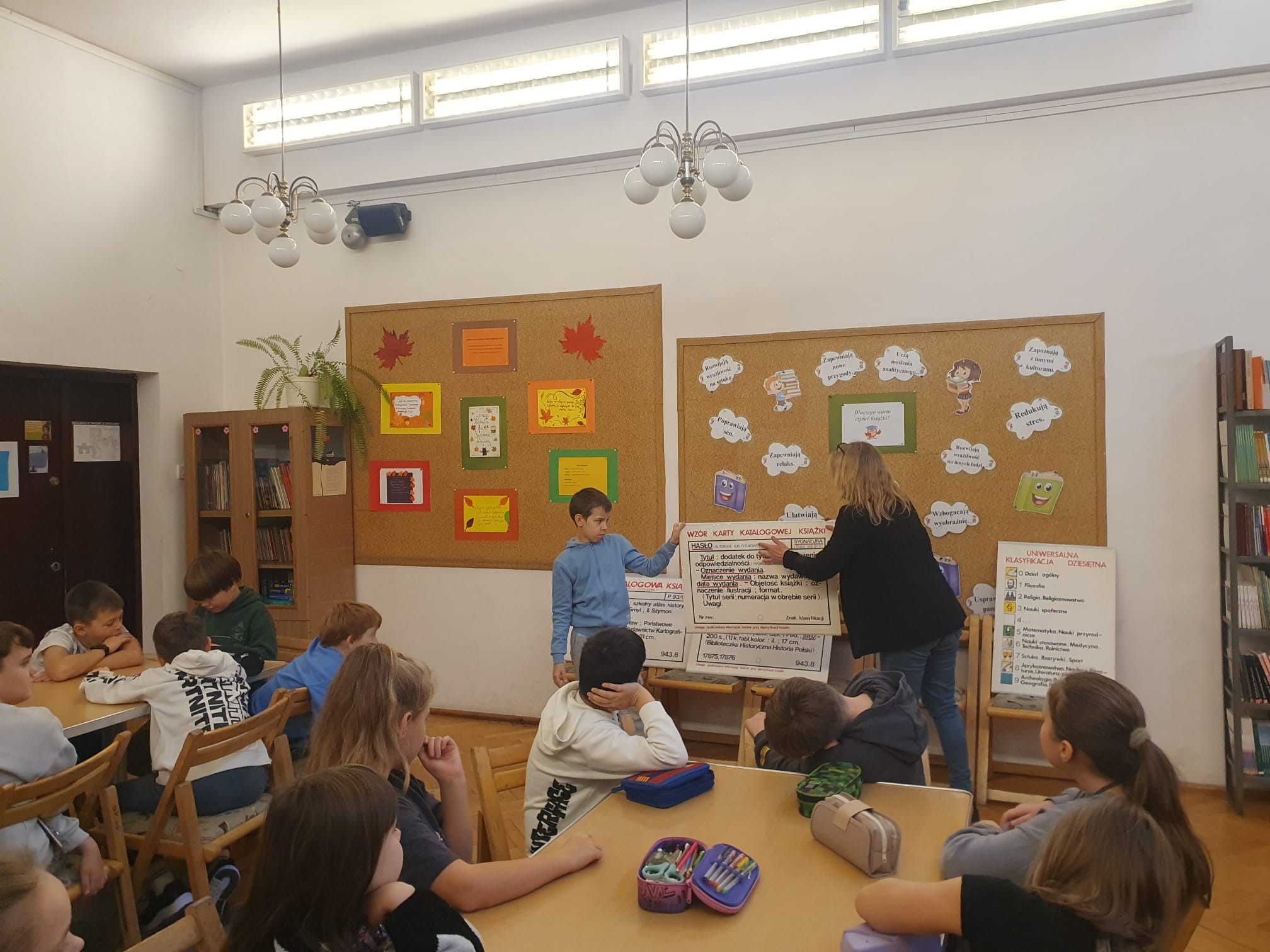W pierwszych tygodniu grudnia w bibliotece szkolnej odbyły się spotkania pt. „Poznajemy budowę karty katalogowej”, które zorganizowane zostały w ramach edukacji czytelniczo-medialnej. W trakcie zajęć uczniowie z klasy 4C i 4D dowiedzieli się co to jest karta katalogowa, poznali elementy opisu bibliograficznego i odkryli tajemnice UKD. Po dawce cennych informacji młodzi miłośnicy opisu książek przystąpili do samodzielnego opracowania wybranych publikacji. Wypełnianie przygotowanych kart pracy; z drobną pomocą bibliotekarza poszło im znakomicie. Na zakończenie spotkań uczestnicy wzięli udział w pamiątkowej sesji fotograficznej – oczywiście w towarzystwie wykorzystywanych wcześniej pomocy dydaktycznych.