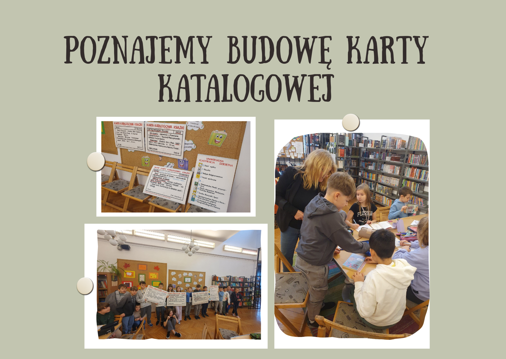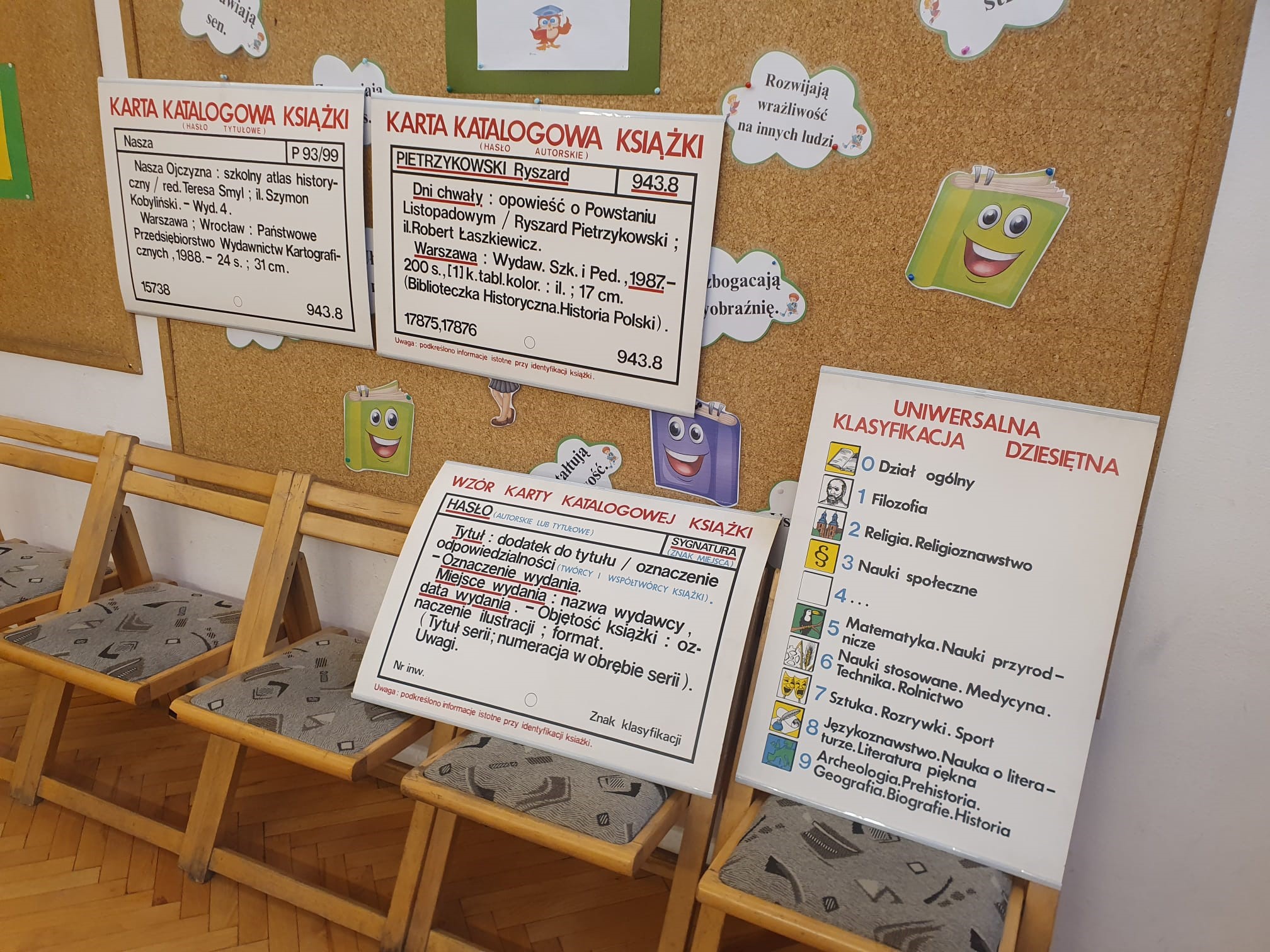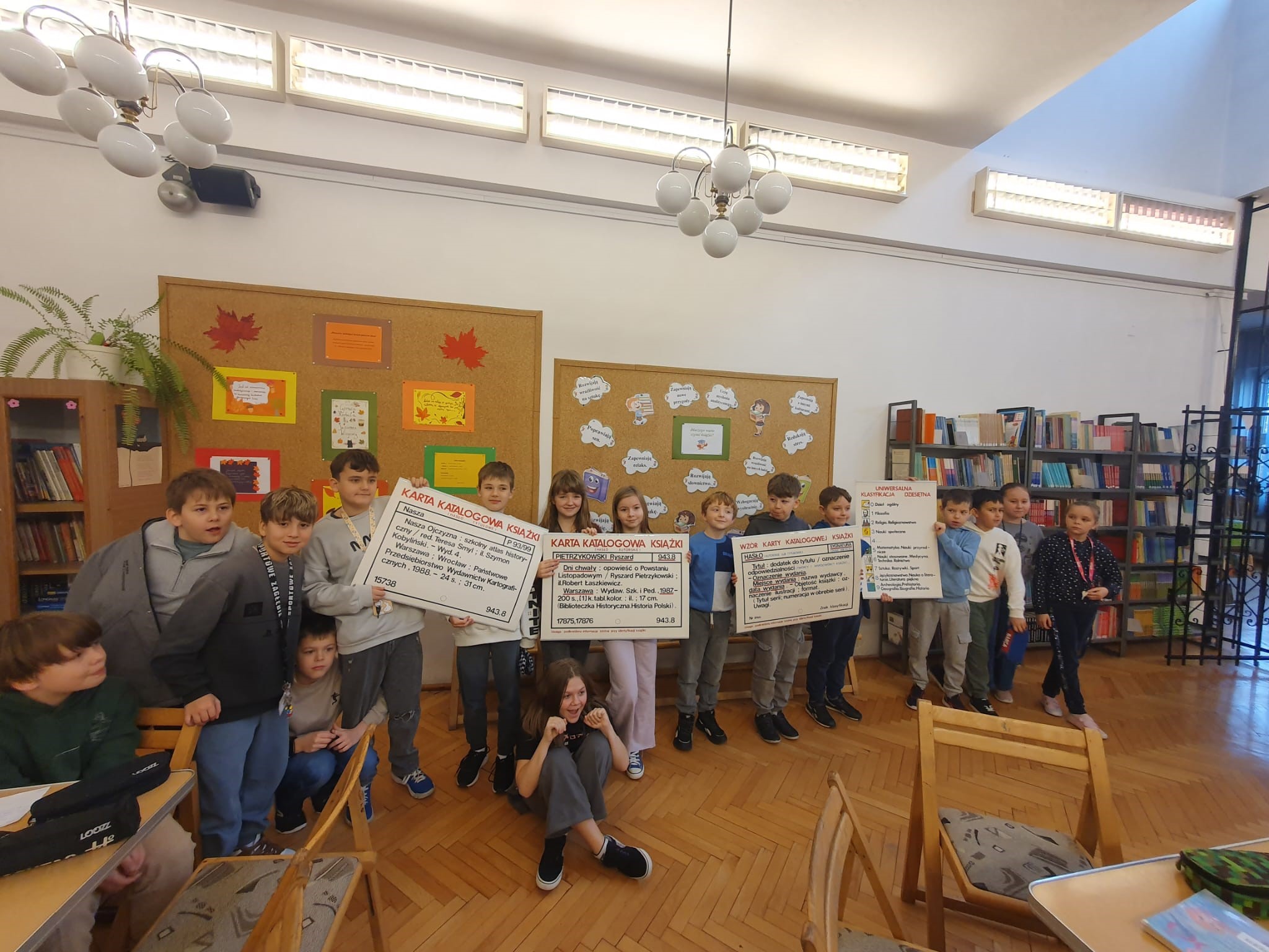 W pierwszych tygodniu grudnia w bibliotece szkolnej odbyły się spotkania pt. „Poznajemy budowę karty katalogowej”, które zorganizowane zostały w ramach edukacji czytelniczo-medialnej. W trakcie zajęć uczniowie z klasy 4C i 4D dowiedzieli się co to jest karta katalogowa, poznali elementy opisu bibliograficznego i odkryli tajemnice UKD. Po dawce cennych informacji młodzi miłośnicy opisu książek przystąpili do samodzielnego opracowania wybranych publikacji. Wypełnianie przygotowanych kart pracy; z drobną pomocą bibliotekarza poszło im znakomicie. Na zakończenie spotkań uczestnicy wzięli udział w pamiątkowej sesji fotograficznej – oczywiście w towarzystwie wykorzystywanych wcześniej pomocy dydaktycznych.