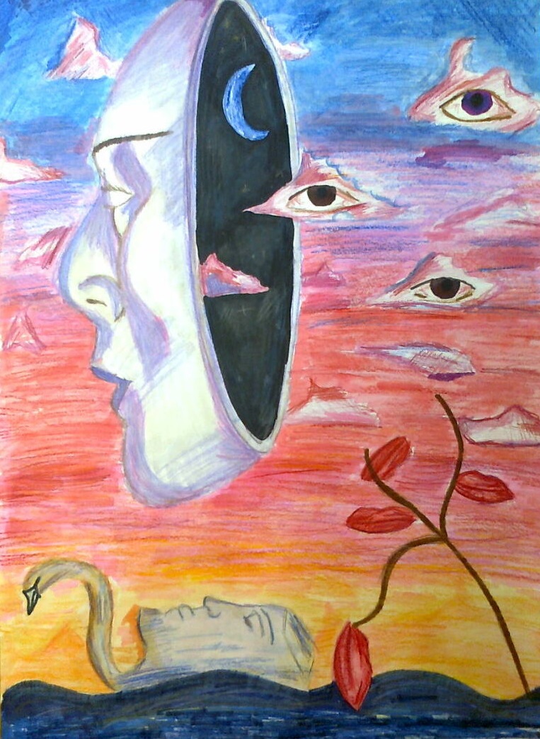 surrealizmem. Praca przyciąga uwagę widza niezwykłą kolorystyką, zachęca do chwili zastanowienia i refleksji. Dajmy popracować naszej wyobrazni.