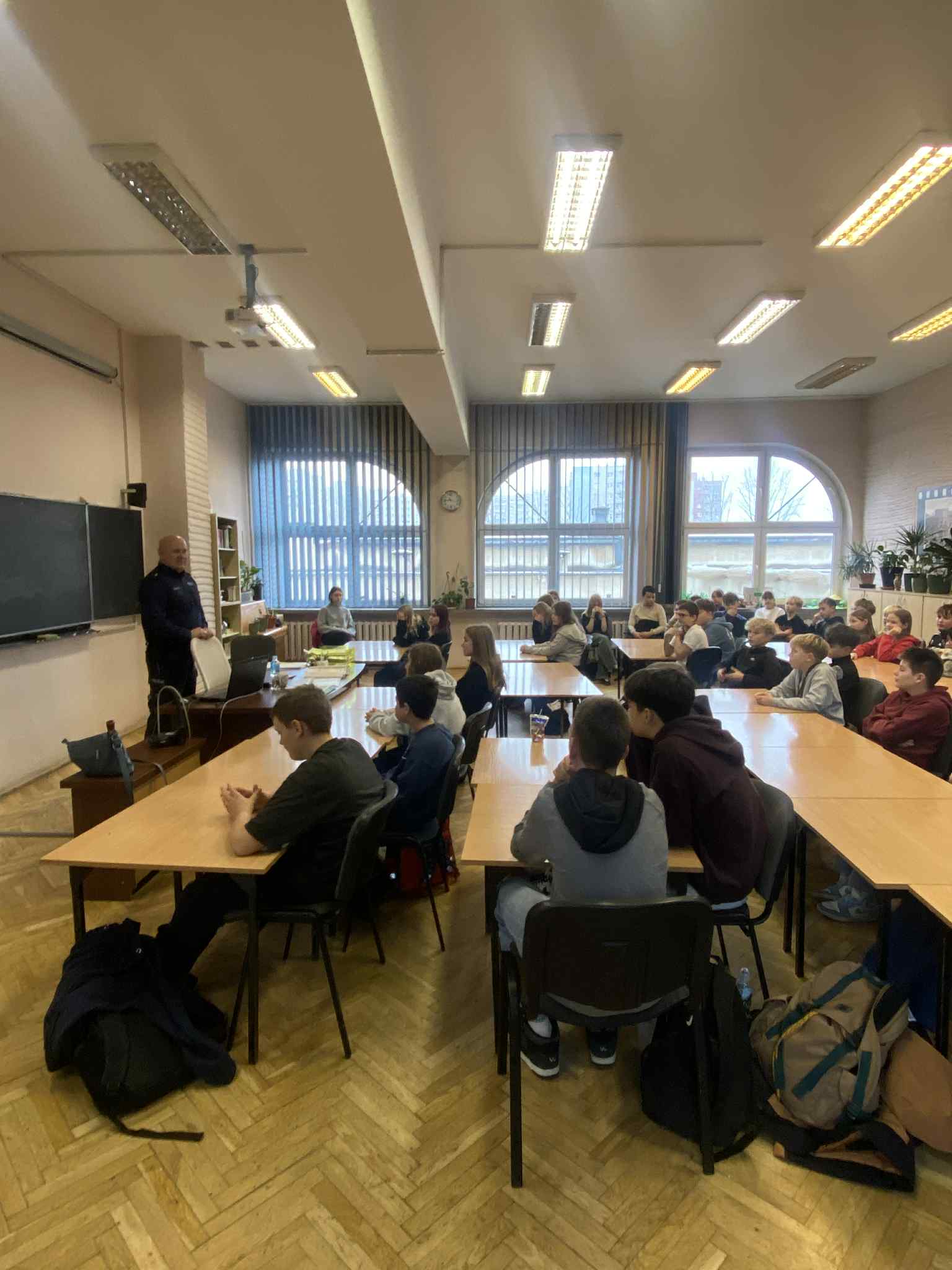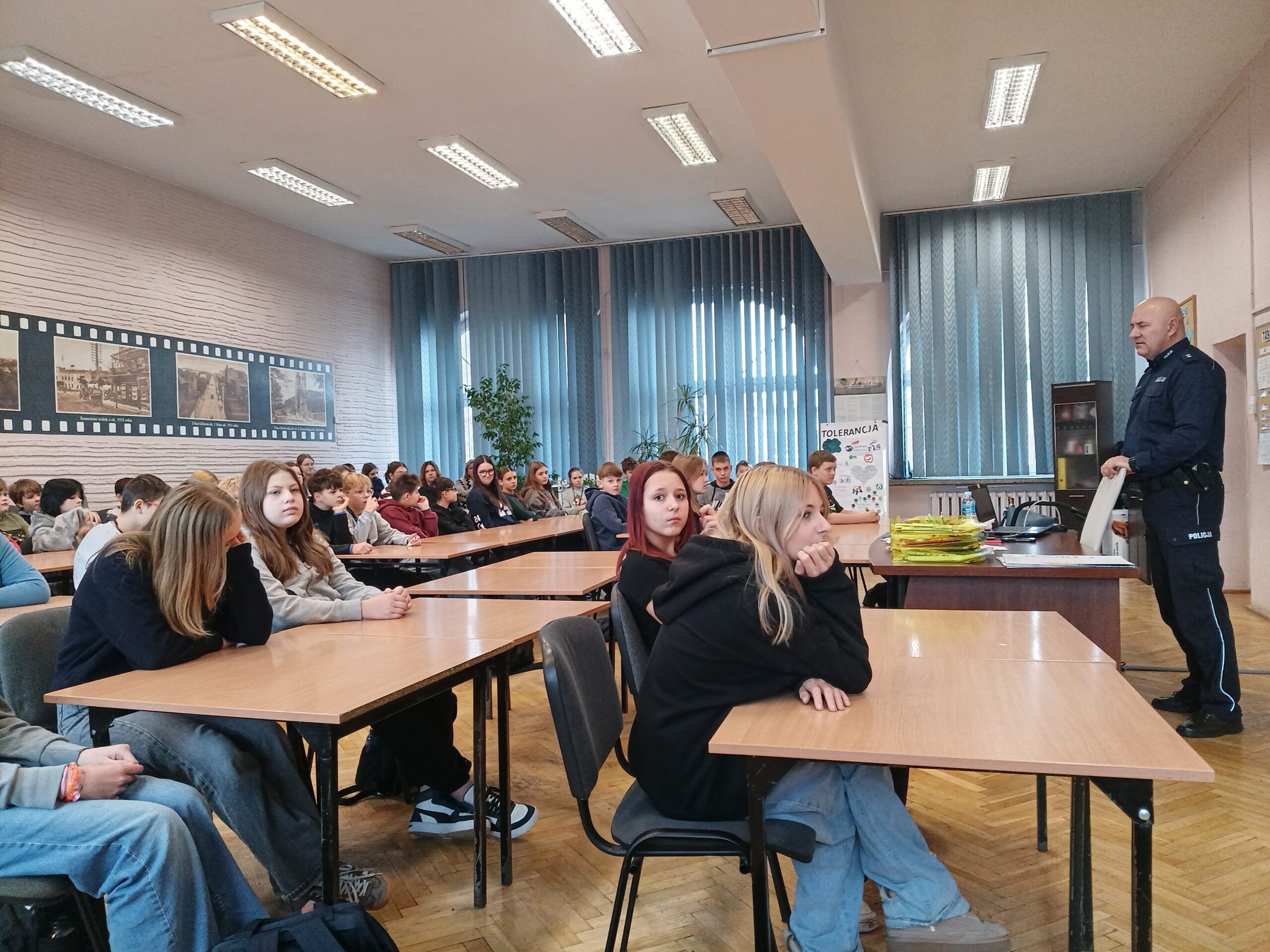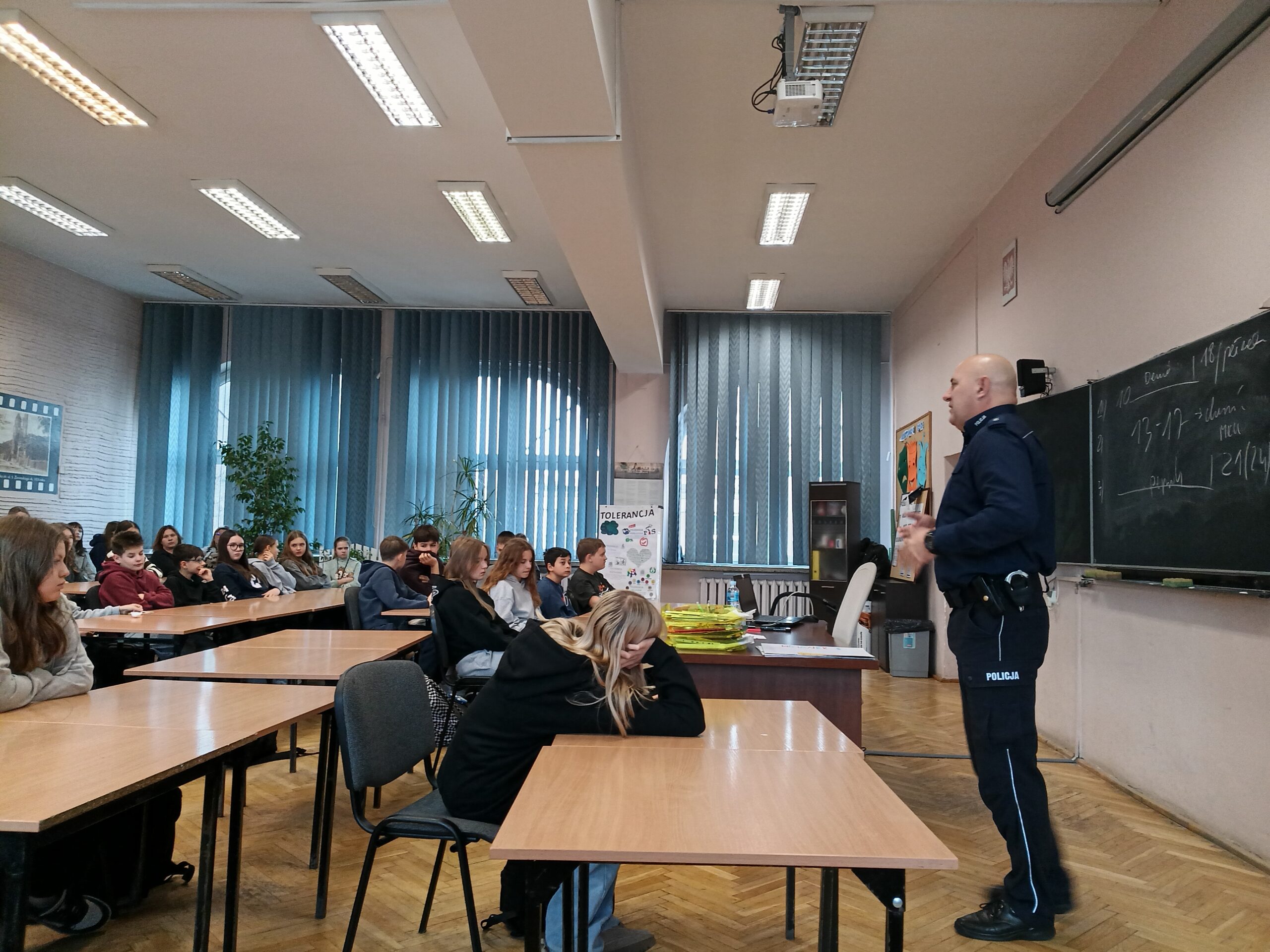 W piątek, 28 listopada, w naszej szkole odbyły się prelekcje prowadzone przez funkcjonariusza Komendy Miejskiej Policji
