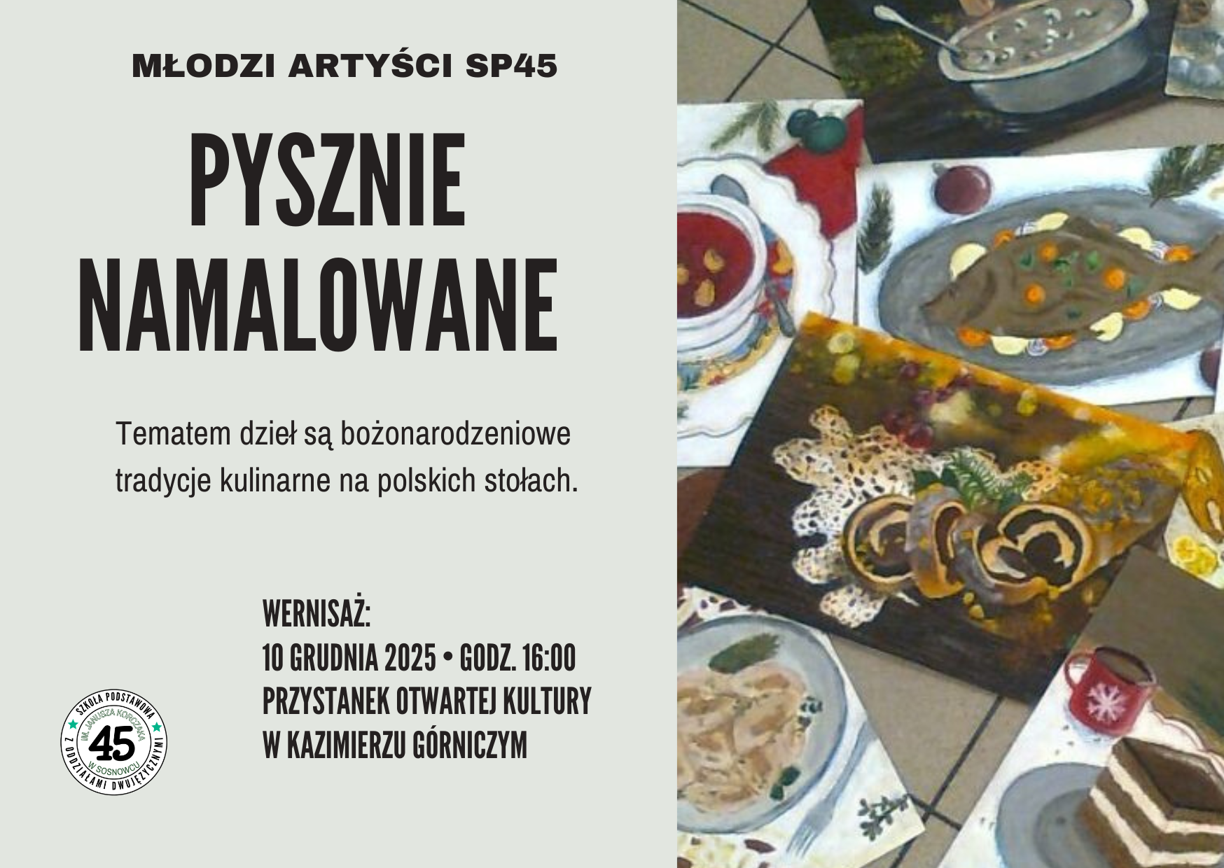 Miło nam poinformować społeczność SP 45, że wielkimi krokami zbliża się wernisaż prac plastycznych wykonanych przez naszych najzdolniejszych młodych artystów. Tematem dzieł są bożonarodzeniowe tradycje kulinarne na polskich stołach. Powstały prace niezwykłe – po prostu „Pysznie namalowane”.