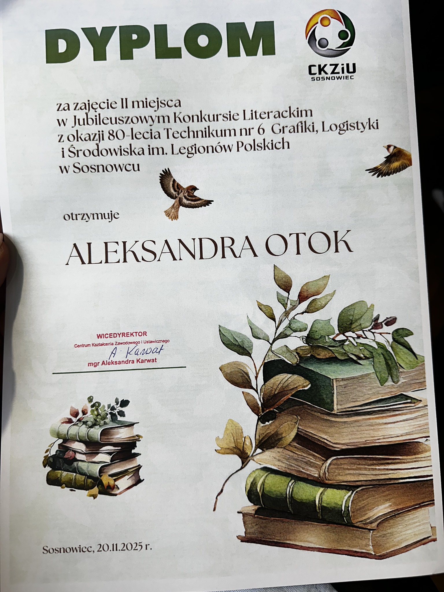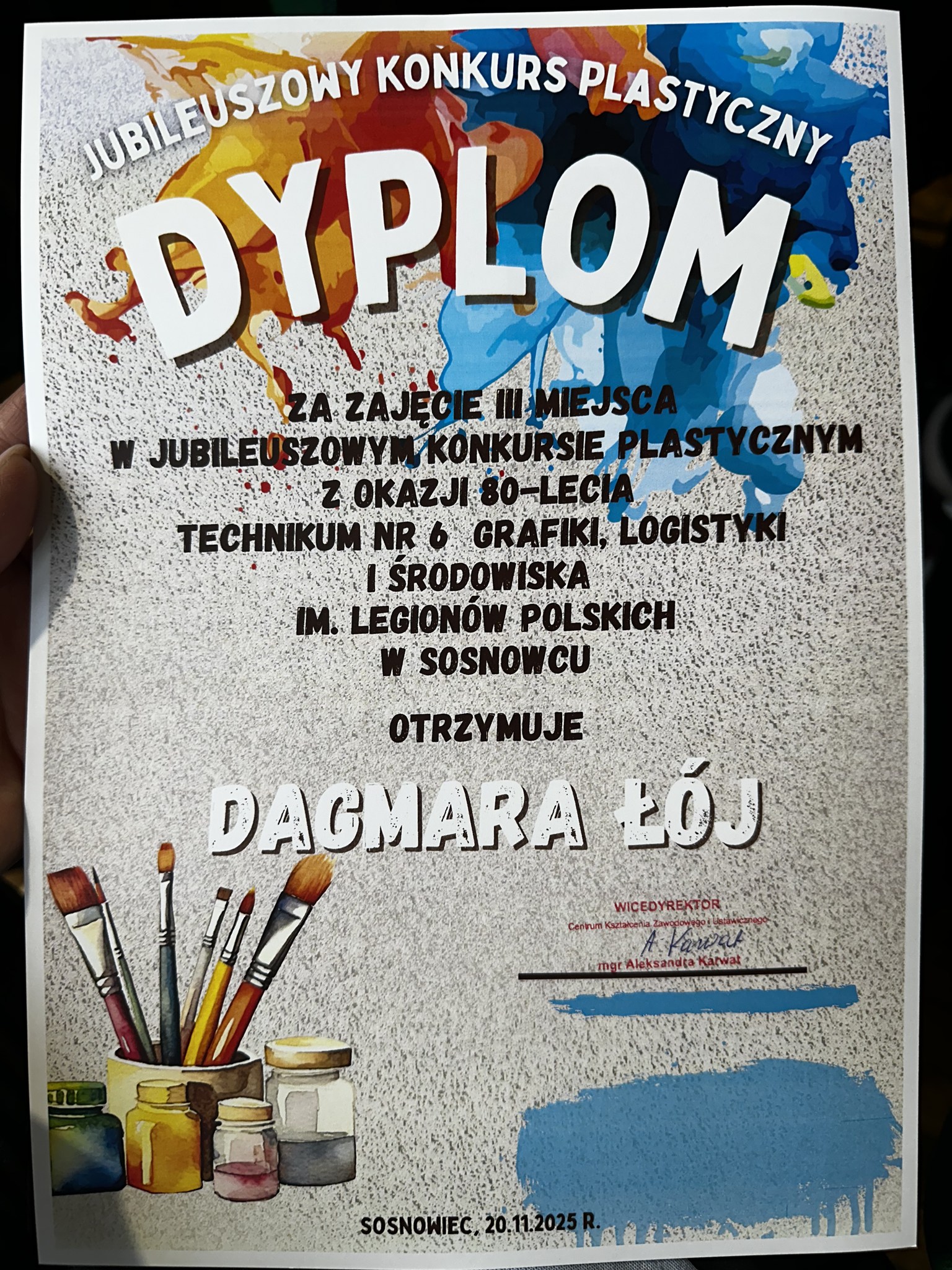 W czwartek 27.11.2025r. odbyło się uroczyste wręczenie dyplomów laureatom Jubileuszowego Konkursu Literackiego i Plastycznego z okazji 80-lecia Technikum nr 6 Grafiki, Logistyki i Środowiska im. Legionów Polskich w Sosnowcu.