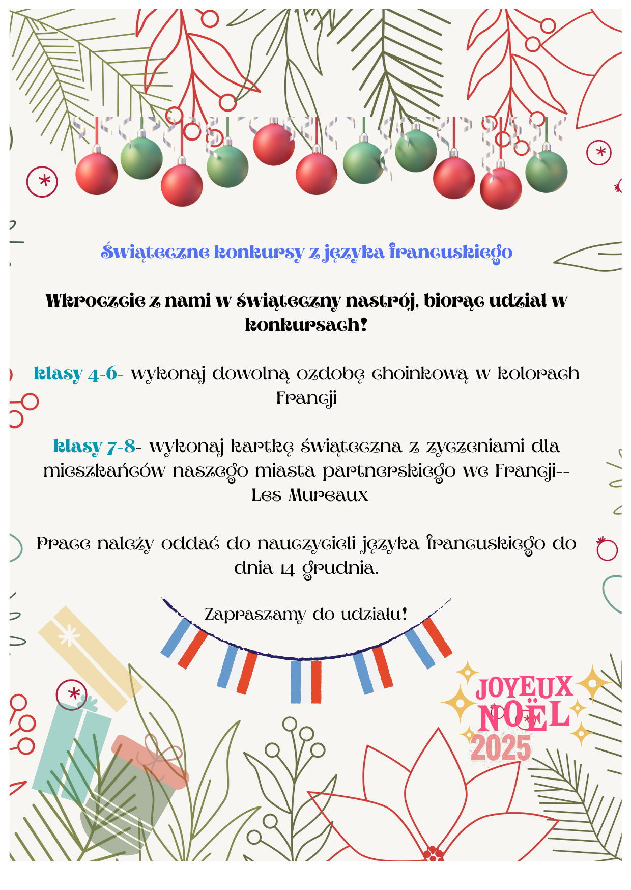 https://sp45.edu.pl/wp-content/uploads/2025/12/frnace-1030x731.png 1030 731 Los Majkelos Los Majkelos https://secure.gravatar.com/avatar/96eacdbeae07327cd9480385eb550516?s=96&d=mm&r=g 3 grudnia 2025 7 grudnia 2025 Wkroczcie z nami w świąteczny nastrój , biorąc udział w konkursach! klasy 4–6 – wykonaj dowolną ozdobę choinkową w kolorach Francji klasy 7–8 – wykonaj kartkę świąteczną z życzeniami dla mieszkańców naszego miasta partnerskiego we Francji – Les Mureaux Prace należy oddać do nauczycieli języka francuskiego do dnia 14 grudnia . Zapraszamy do udziału! Joyeux Noël 2025