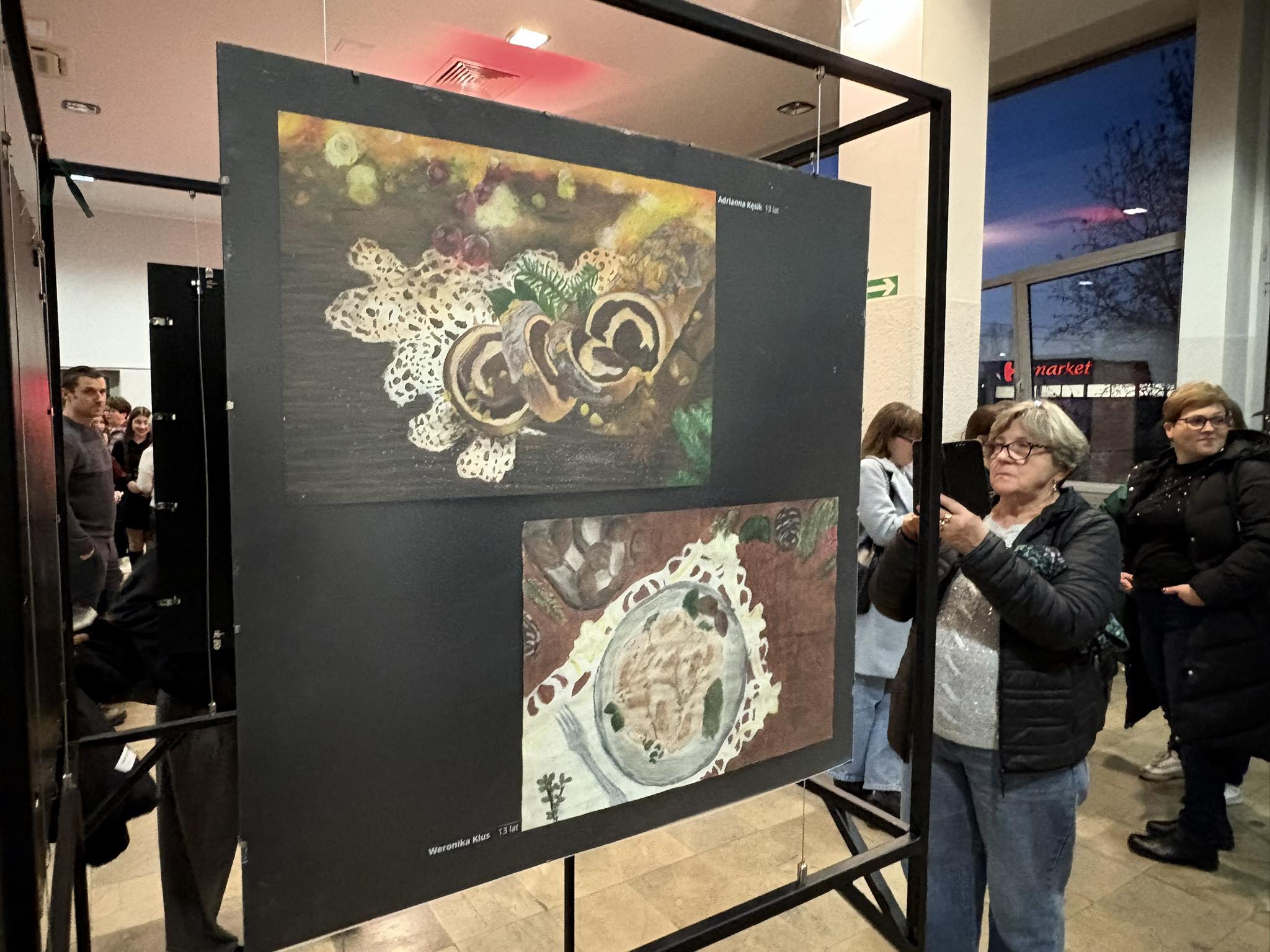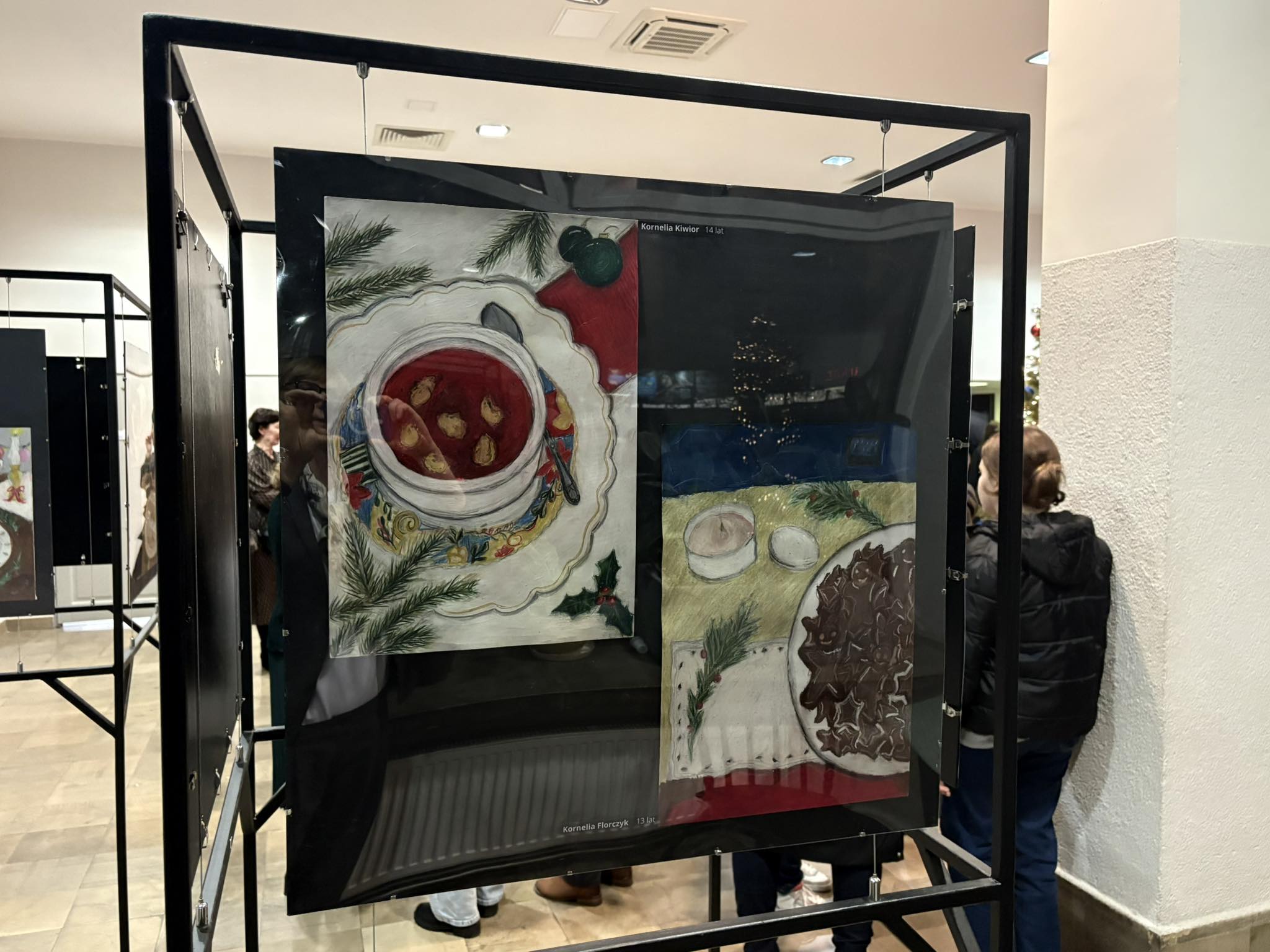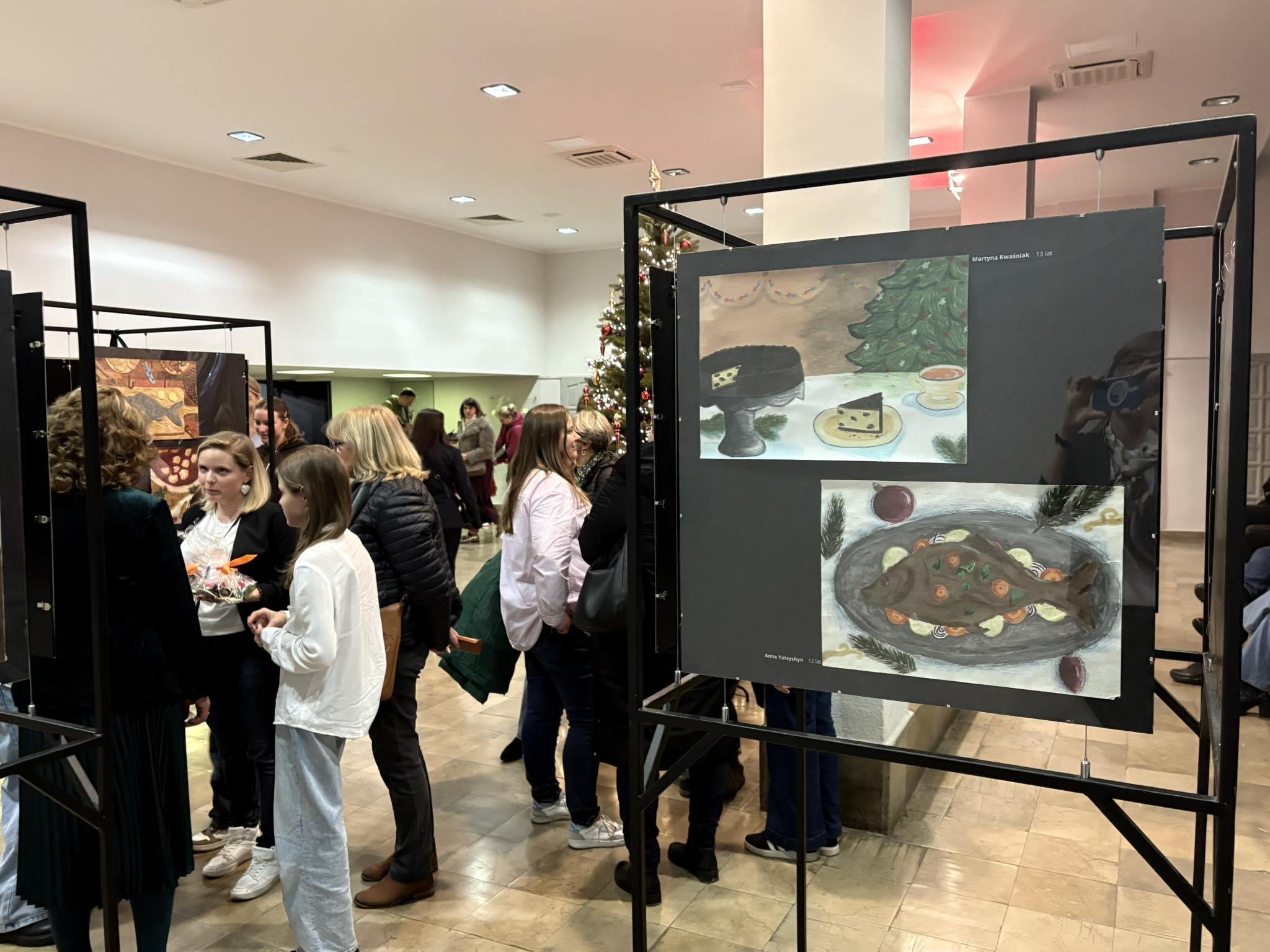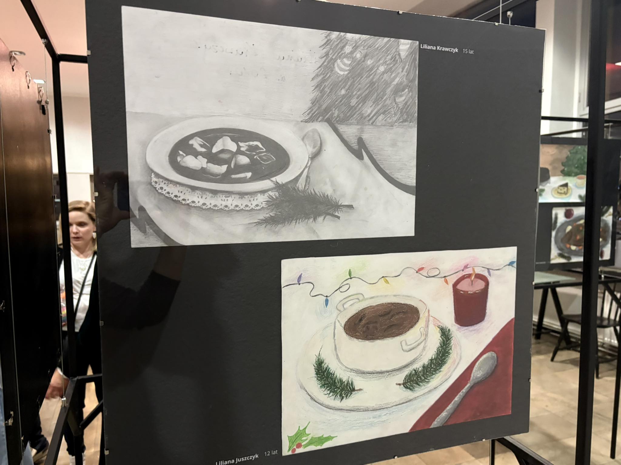 Przybyła publiczność – Pani Dyrektor Anna Łakomska-Ciołczyk, Pani Wicedyrektor Katarzyna Pluta, Rodzice i Dziadkowie młodych artystów oraz pracownicy Przystanku – z zachwytem komentowali zilustrowane potrawy bożonarodzeniowe. Przepiękna barwa czerwonego barszczu , smakowite karpie z chrupiącą skórką, bajeczne makowce z błyszczącą polewą lukrową , puszyste serniczki i pierniki, których zapach wydawał się unosić w powietrzu.