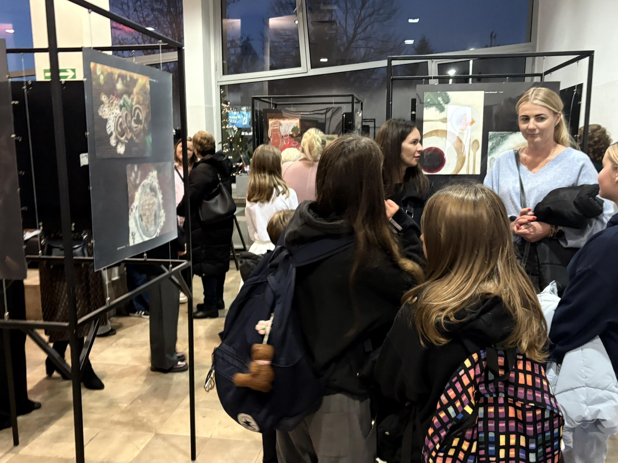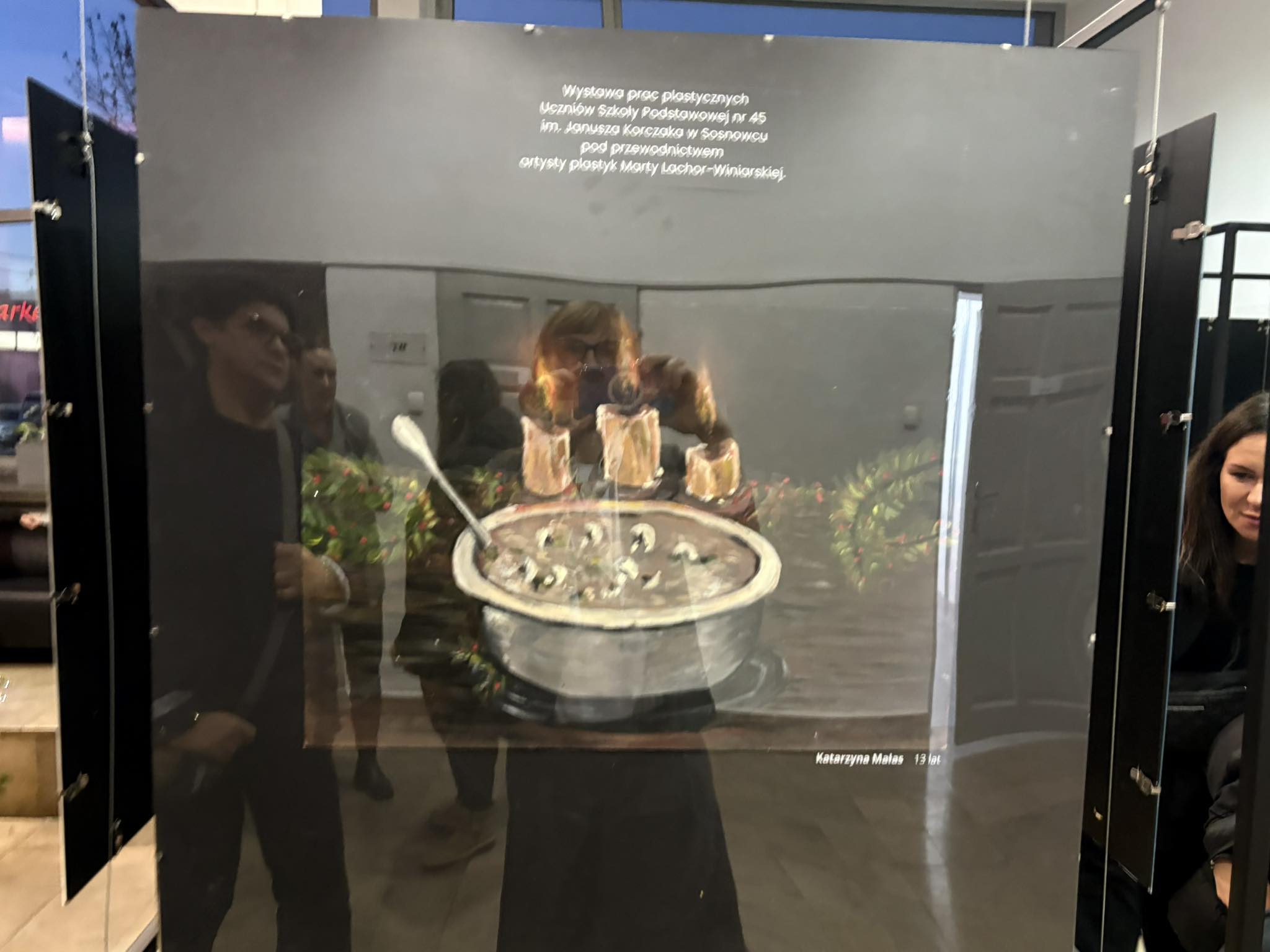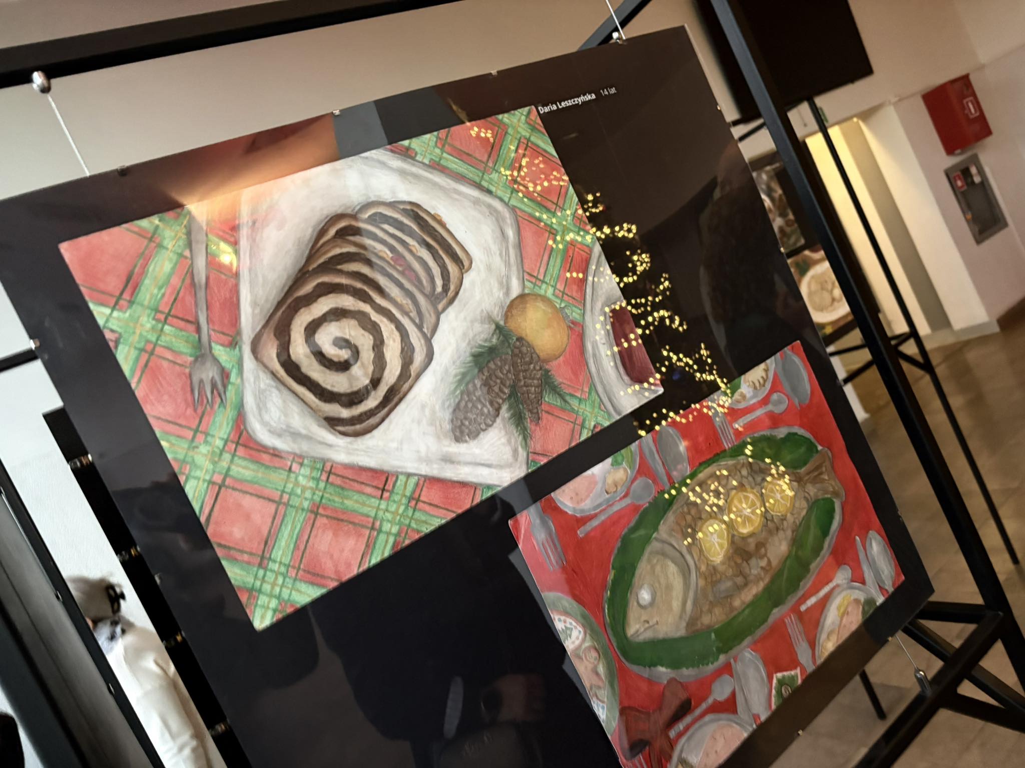. Ogromny hol wypełnił się wspaniałą atmosferą i wigilijnymi potrawami . Wszystko za sprawą wystawy prac „Pysznie namalowane”, wykonanych przez młodych artystów z SP 45.