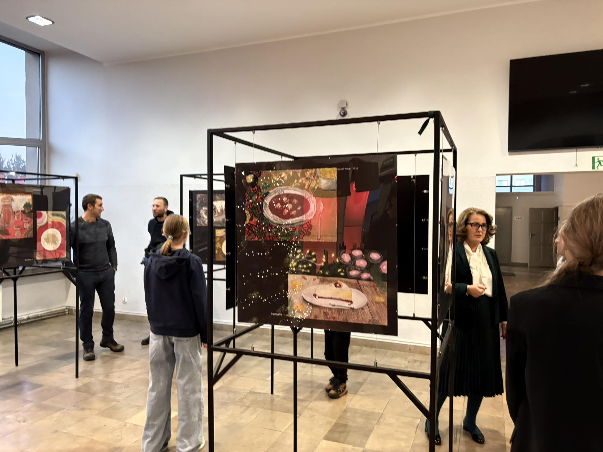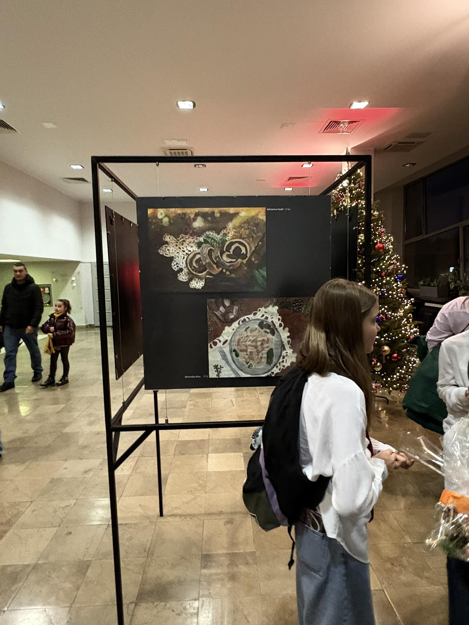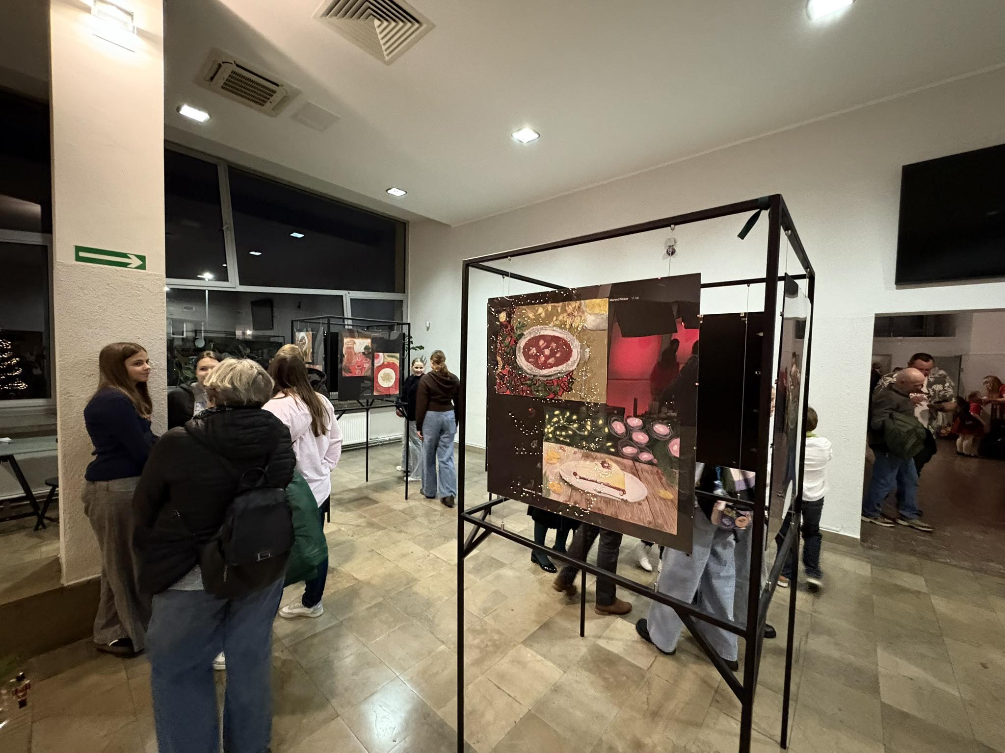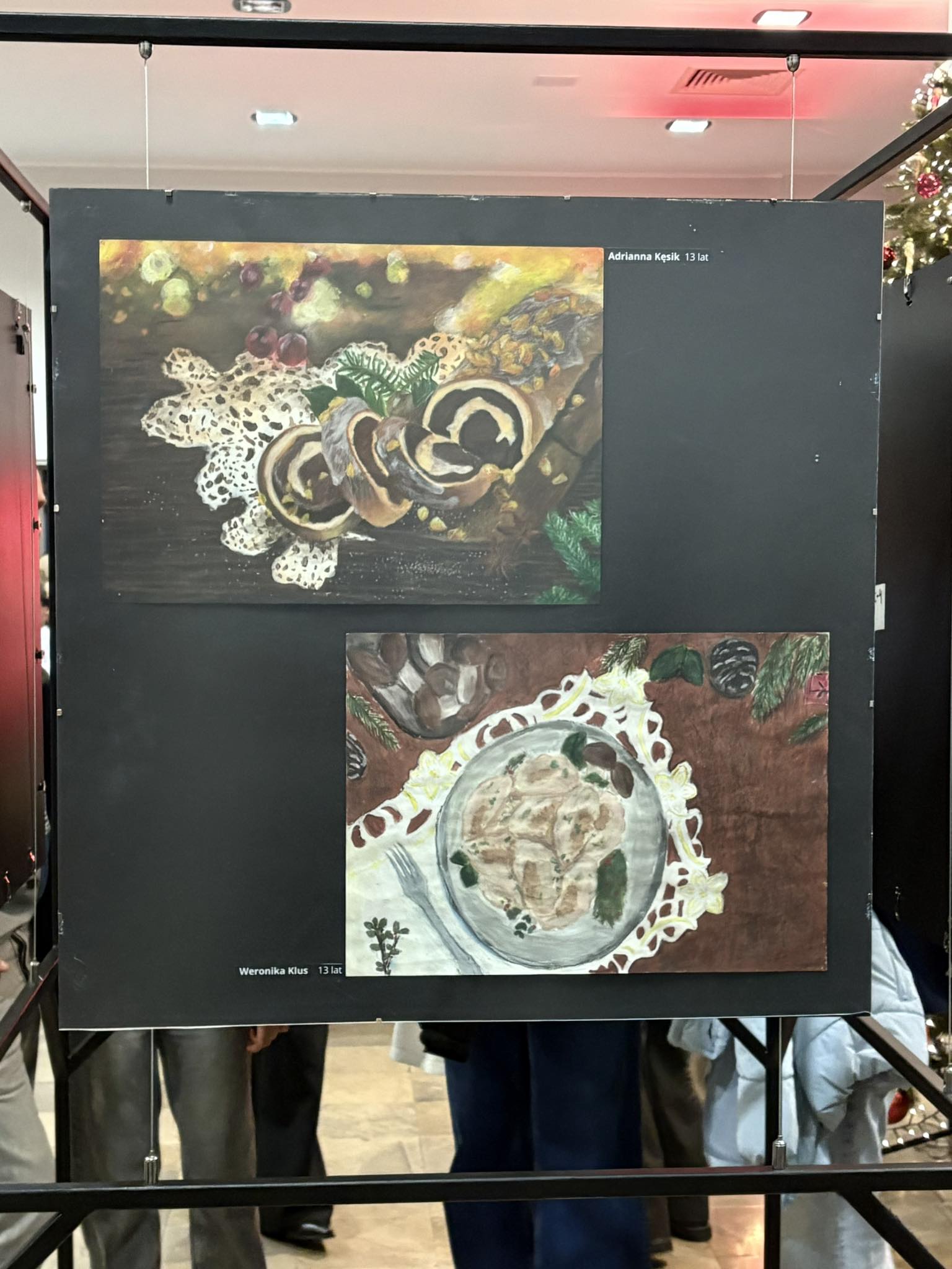 . Ogromny hol wypełnił się wspaniałą atmosferą i wigilijnymi potrawami . Wszystko za sprawą wystawy prac „Pysznie namalowane”, wykonanych przez młodych artystów z SP 45.