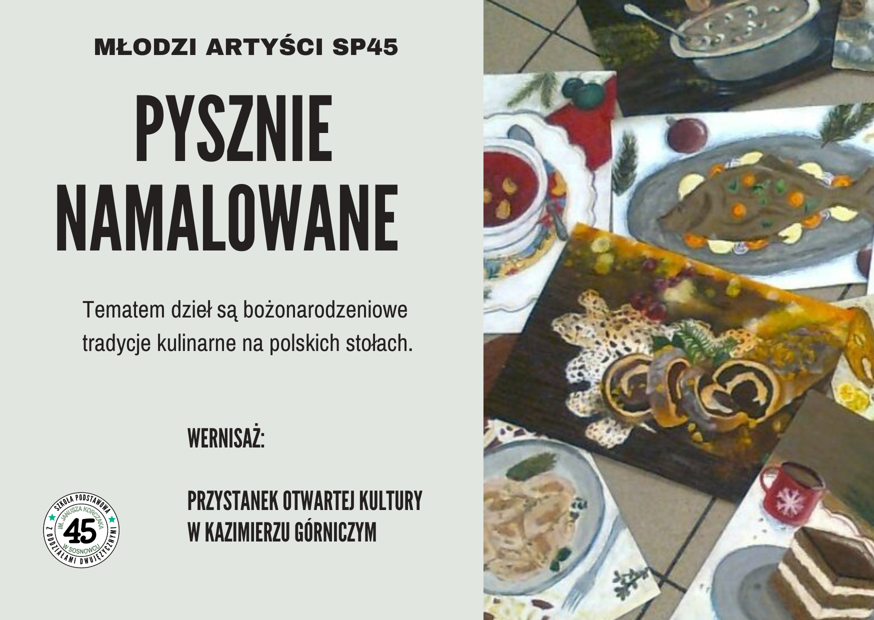 . Ogromny hol wypełnił się wspaniałą atmosferą i wigilijnymi potrawami . Wszystko za sprawą wystawy prac „Pysznie namalowane”, wykonanych przez młodych artystów z SP 45.
