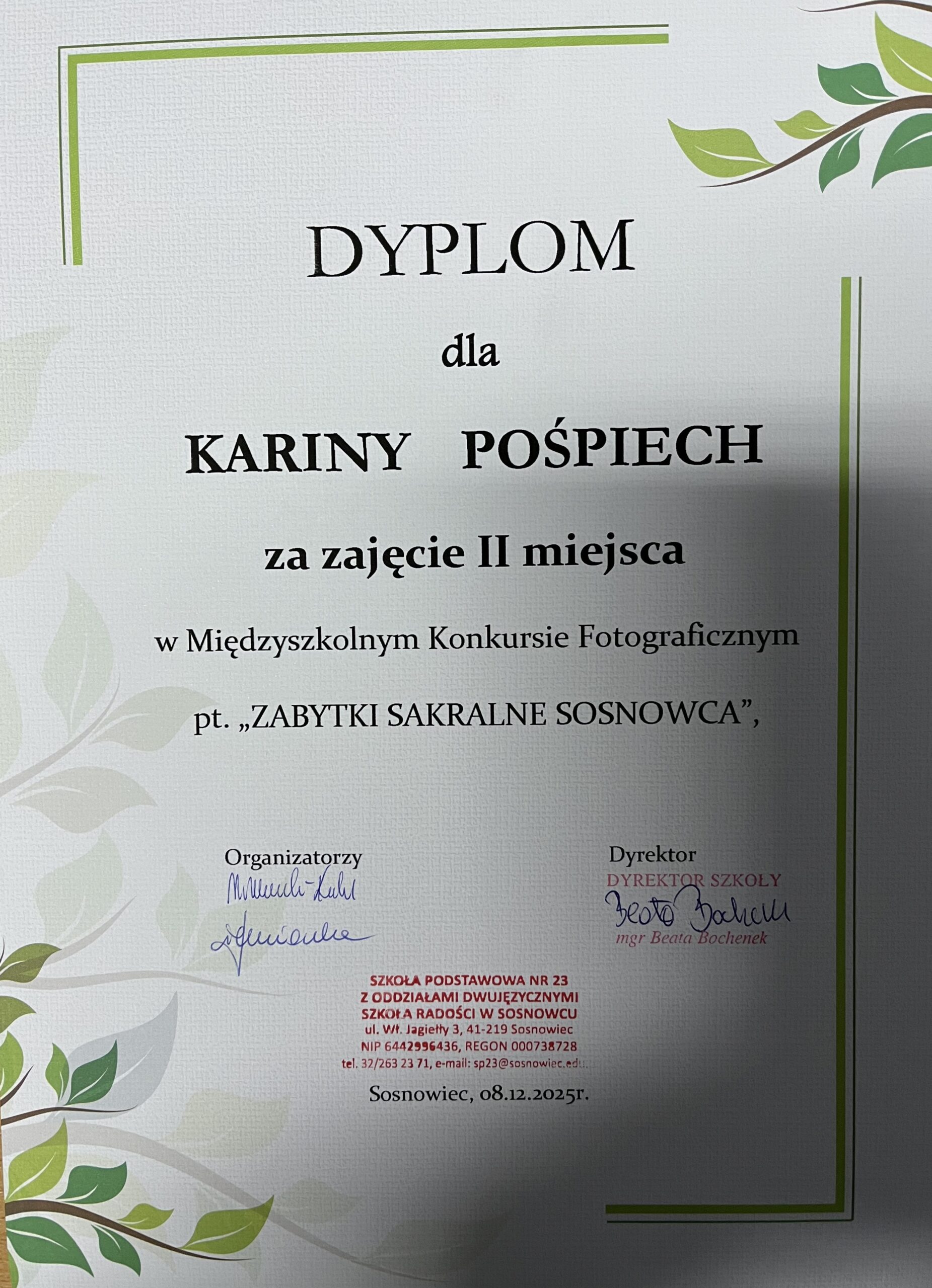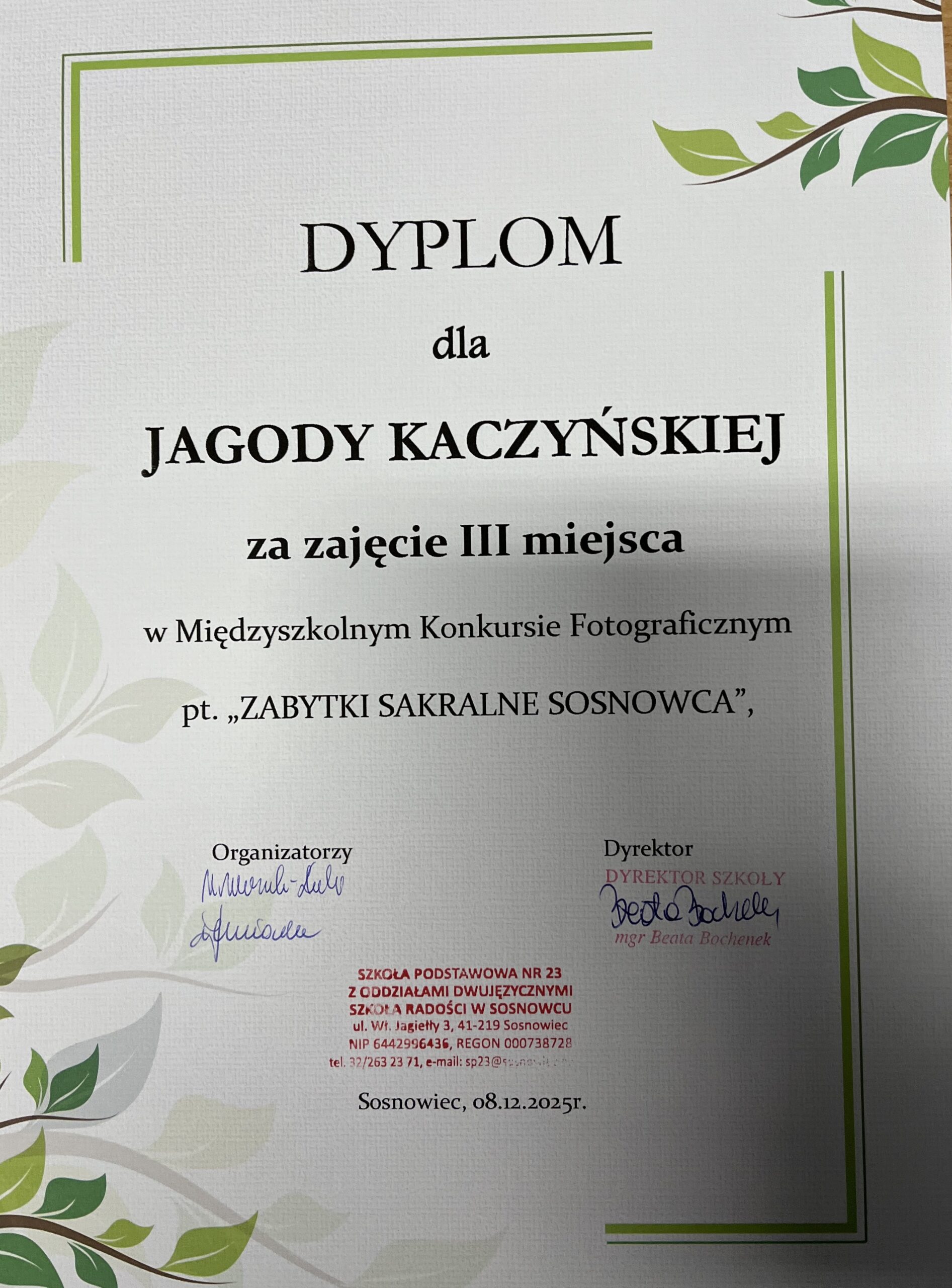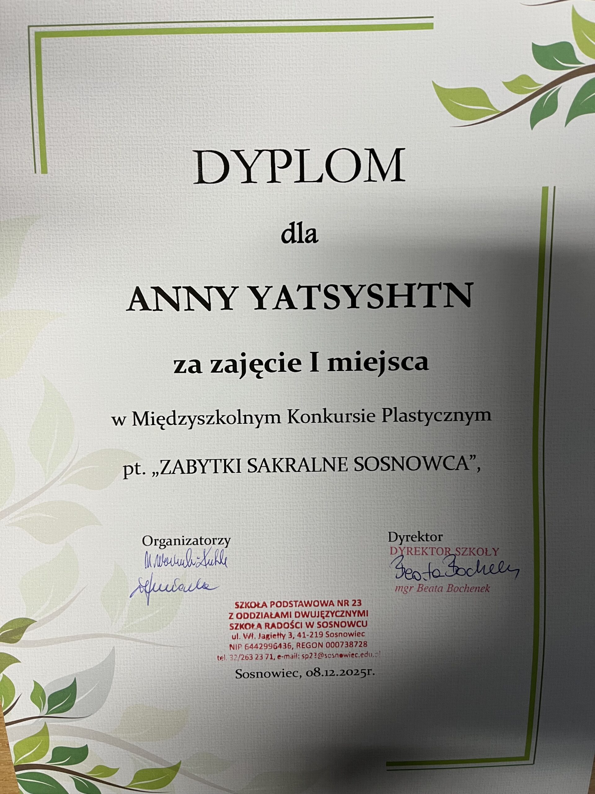 W międzyszkolnym konkursie „ZABYTKI SAKRALNE SOSNOWCA”, organizowanym przez SP 23 w Sosnowcu, nasi uczniowie zajęli następujące miejsca: