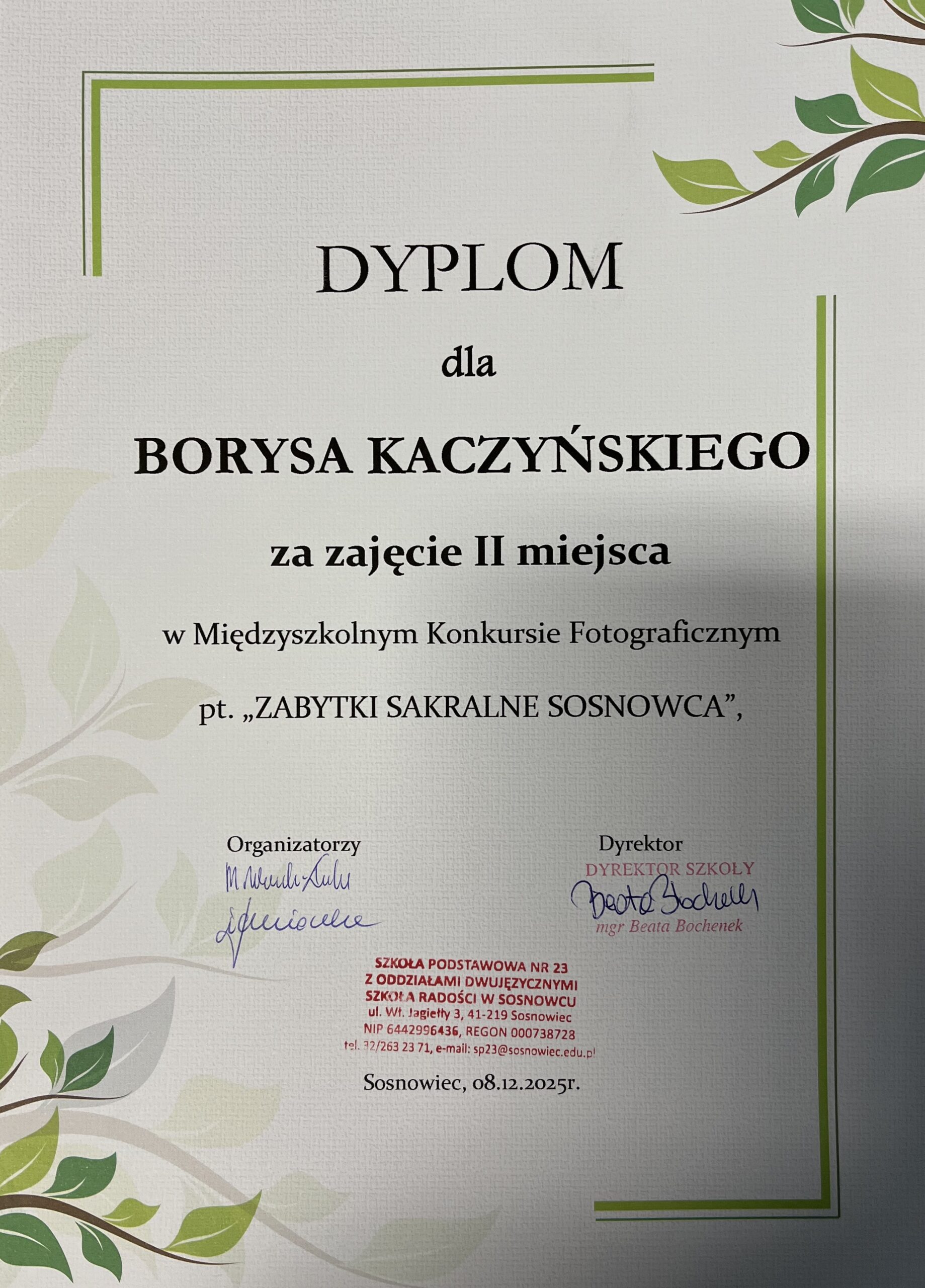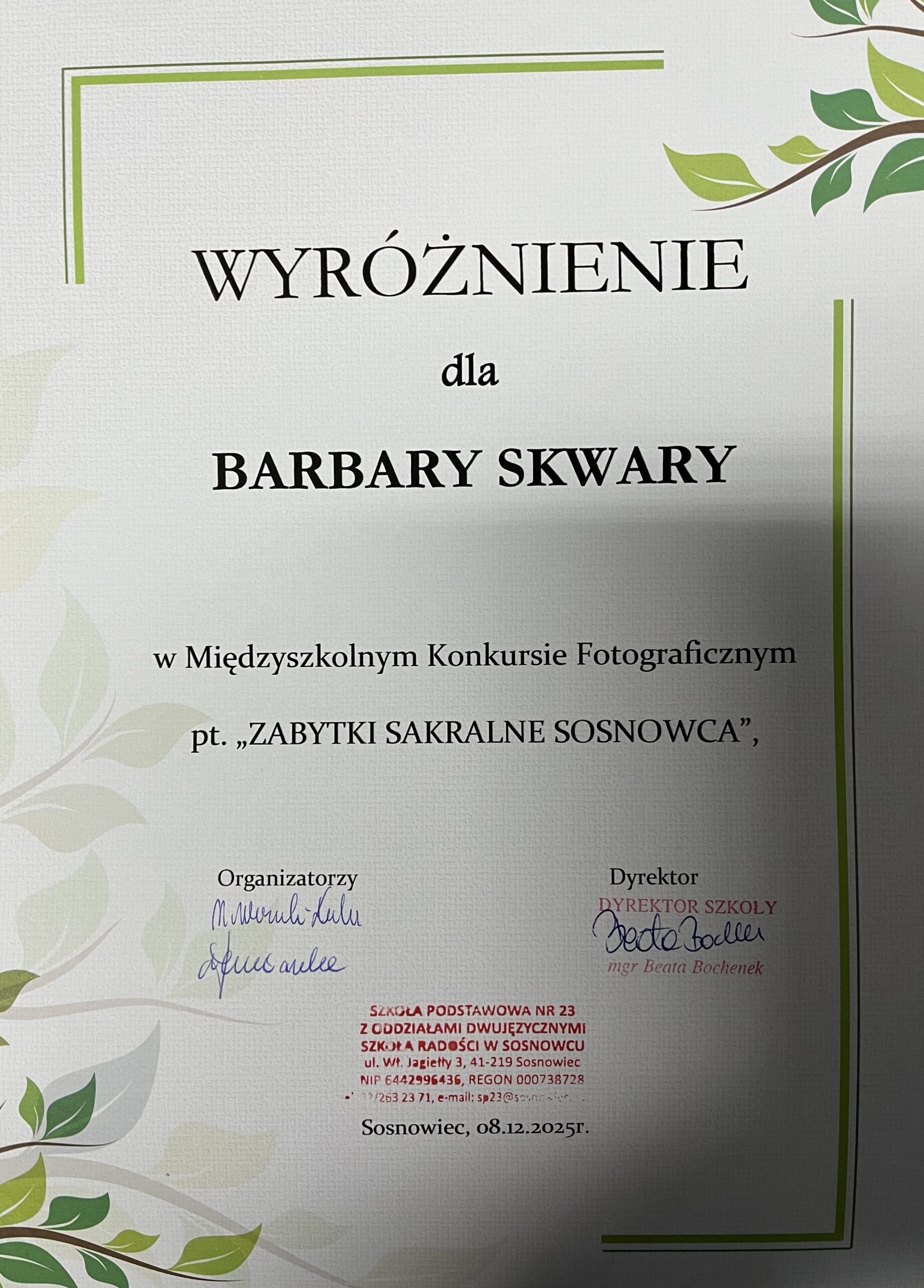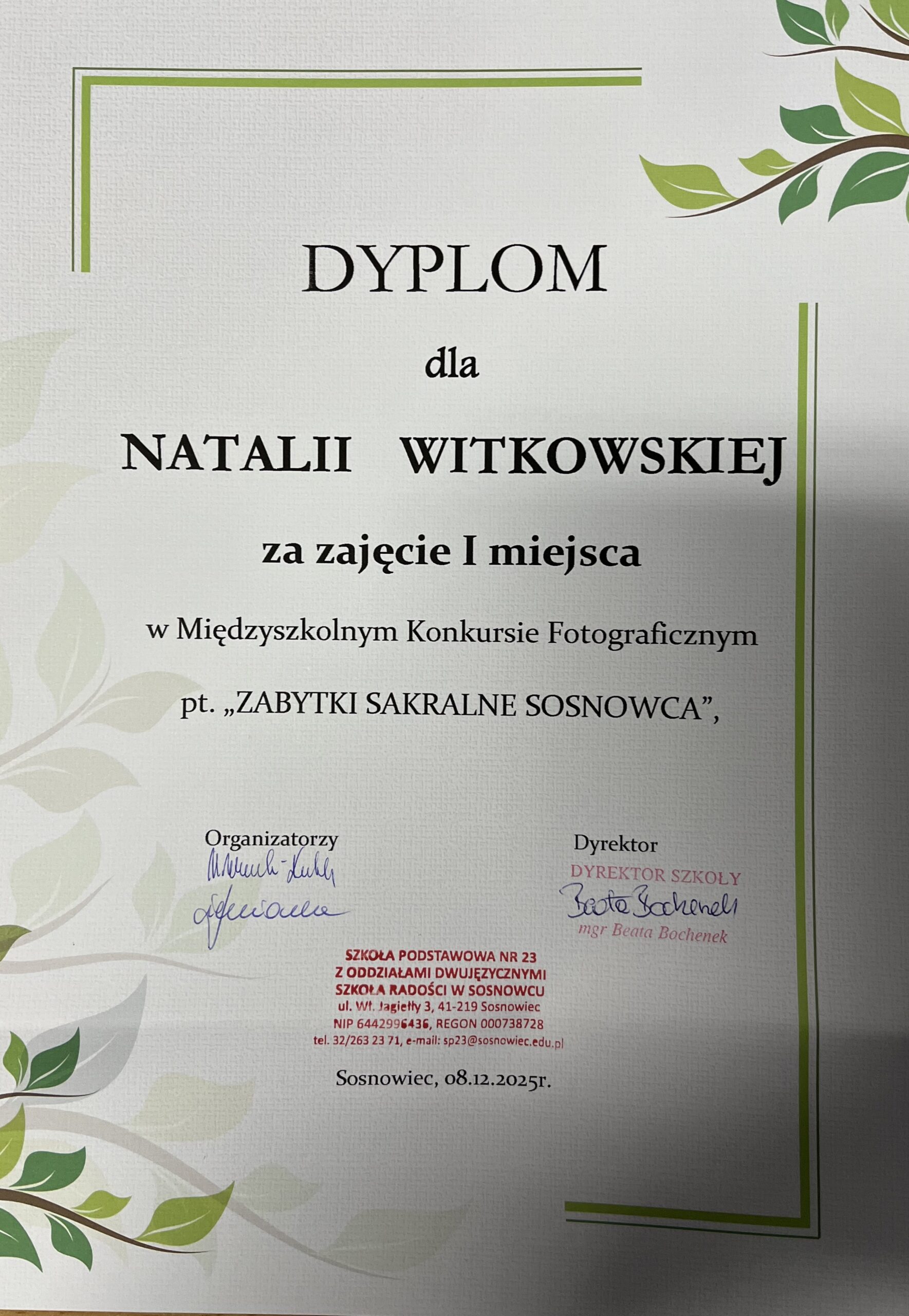 W międzyszkolnym konkursie „ZABYTKI SAKRALNE SOSNOWCA”, organizowanym przez SP 23 w Sosnowcu, nasi uczniowie zajęli następujące miejsca: