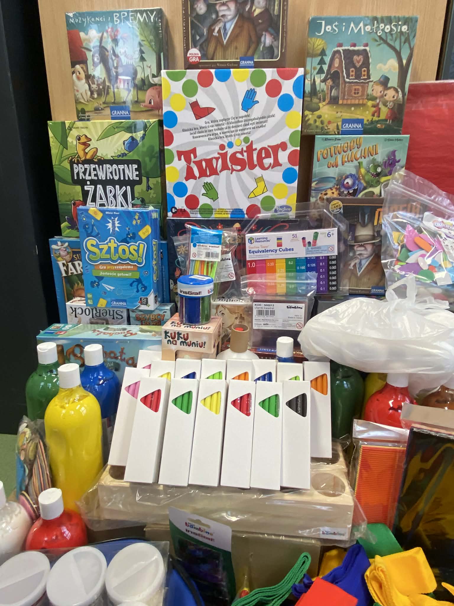 Zebrane kupony zostały wymienione na atrakcyjne nagrody dla szkoły, które będą służyć naszym uczniom podczas zajęć edukacyjnych i rozwojowych (nagrody widoczne na zdjęciu).