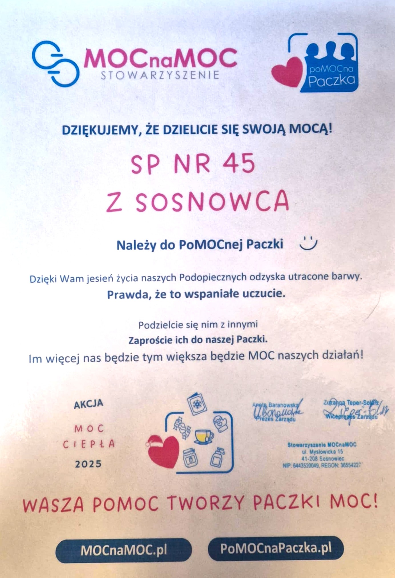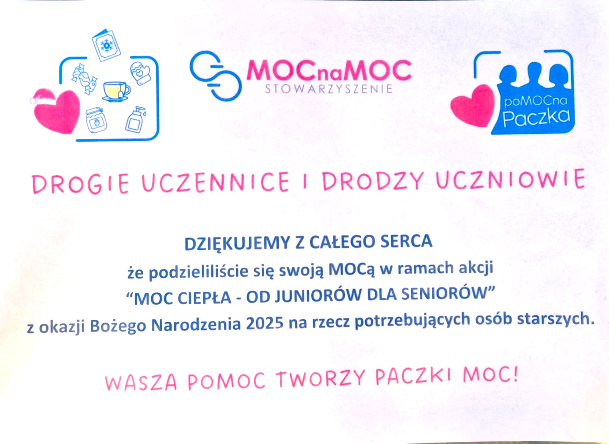 Z całego serca dziękujemy Wam za wsparcie szkolnej akcji charytatywnej na rzecz seniorów z Sosnowca, organizowanej wspólnie ze Stowarzyszeniem MOCnaMOC.